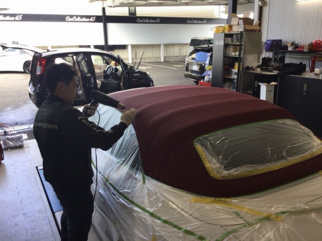 ヒートガンで温めながら幌にコーティング剤を塗り込んでいきます!!