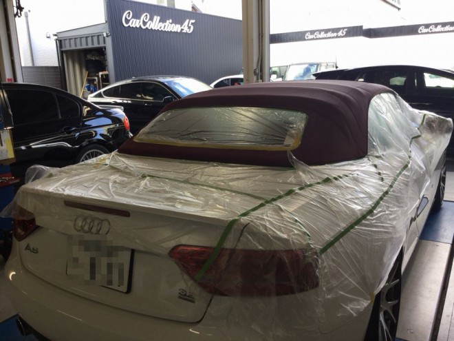 作業前に幌をきれいに洗って、幌以外の部分をしっかりマスキングしていきます!