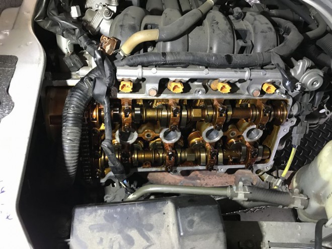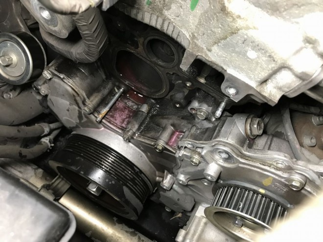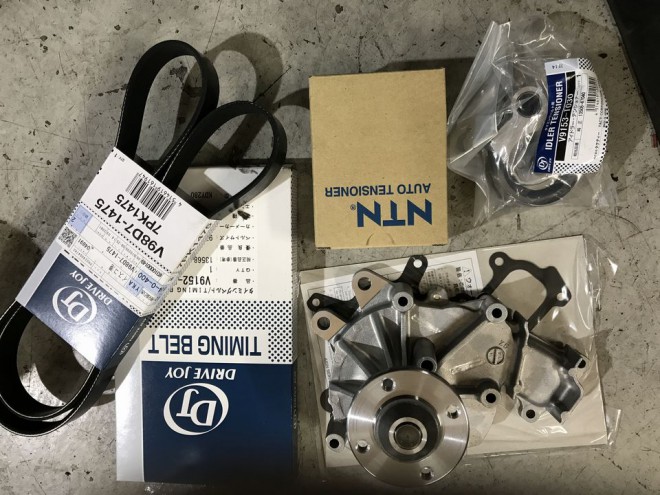 ウォーターポンプ交換の写真です!ウォーターポンプ交換までにタイミングベルト、Vベルト、Vベルトテンショナー、オルタネーター、カムプーリーなど色々取り外してやっと交換出来るのです!