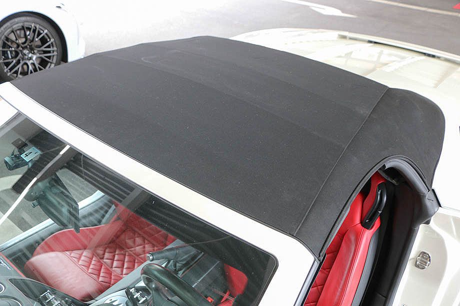 エクステリアには、特別カラーとなるバルーンホワイト(パール)のボディーカラーにブラックソフトトップが組み合わさり、更にメッシュ部分をグロスブラックでカスタムペイント(フロント、サイド、リア)が施されております!!