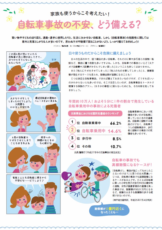 自転車事故による損害賠償責任を補償する保険は、自転車向け保険のほか、自動車保険や火災保険の特約、会社等の団体保険など様々な種類があります。