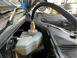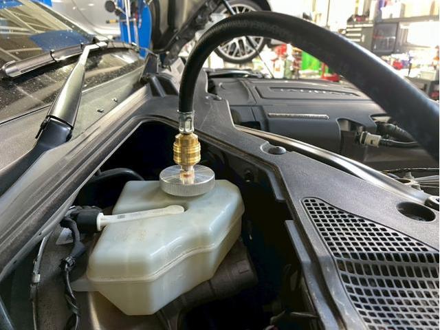 リザーバーキャップに専用のアタッチメントを取付け、規定圧力でブレーキフルードを圧送します。