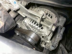 新品オルタネーターを取り付け、ベルトの張りを調整していきます。