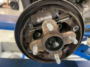 次はブレーキ点検です。フロントパッド、リヤシュー共に残量正常です。片減りもなく、固着もありません。