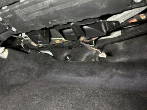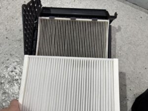 内気フィルタは助手席足元カバーを外し交換いたしました。こちらも汚れがはっきりわかります。エアコンの風はフィルタを介して吹き出し口にでますので定期的な交換をおすすめ致します。