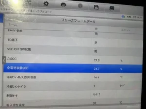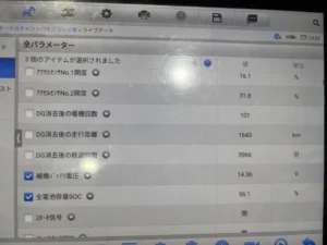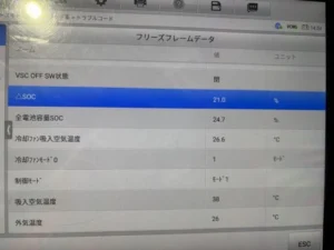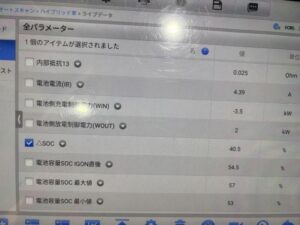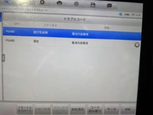 診断機にて確認をしていきます。ダイアグはP0A80 電池内部異常。