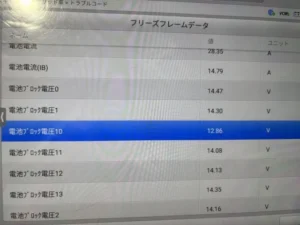 FFDより、ダイアグ点灯時の状況をみていきます。10番電池ブロックの電圧が低いです。