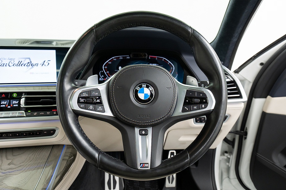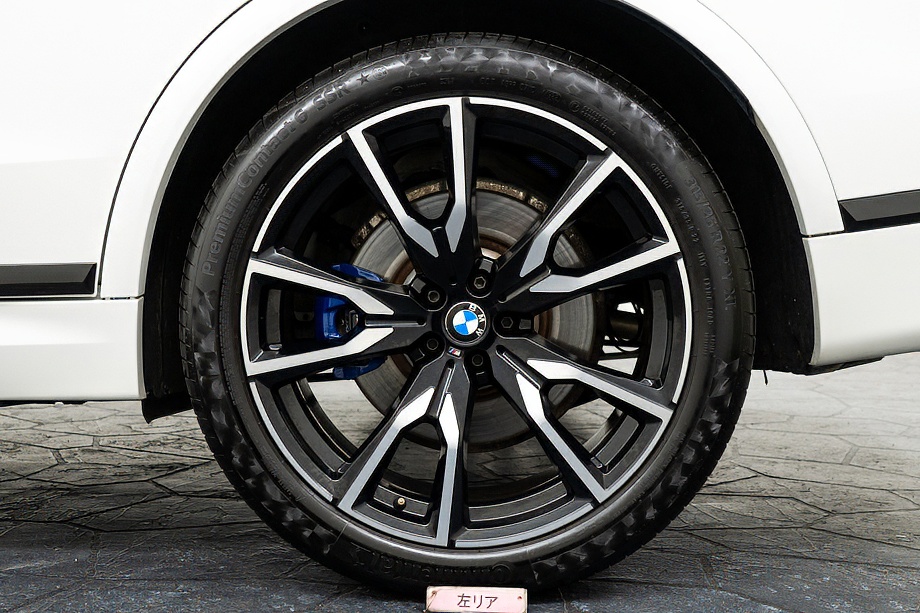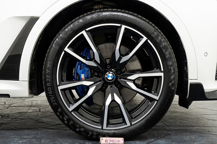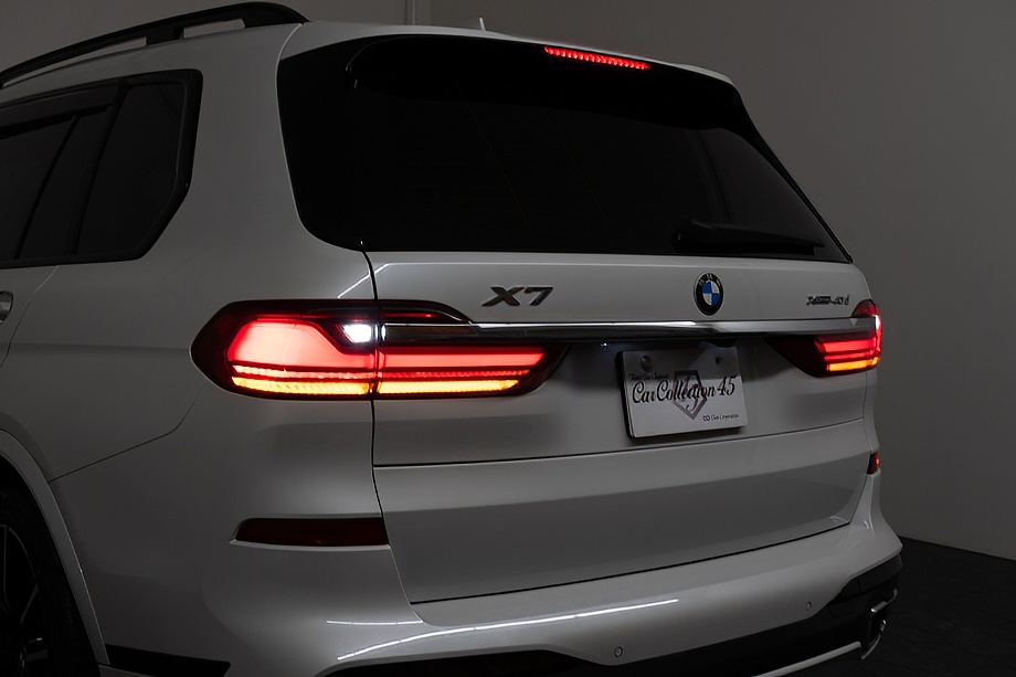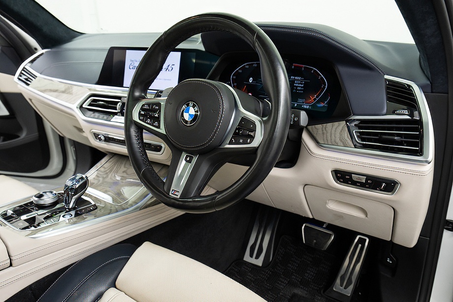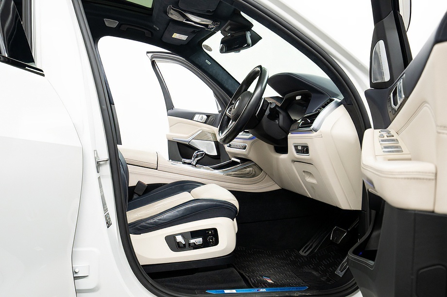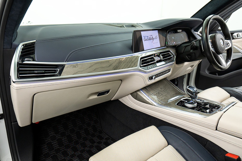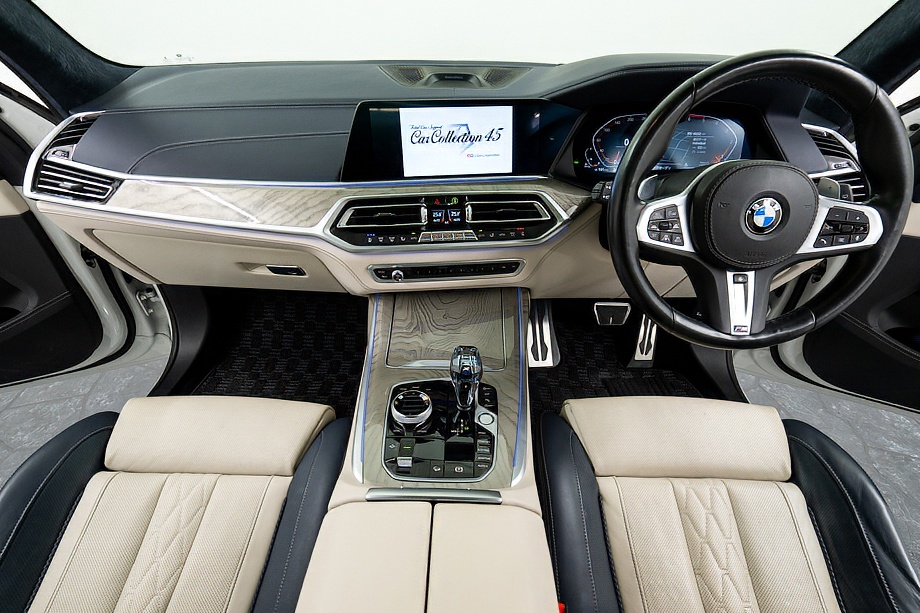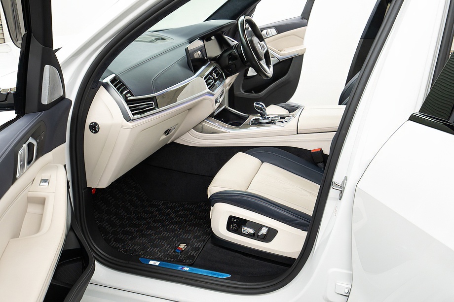 まず目を引くのは、ミネラルホワイトのボディに映える堂々たる佇まい。全長5メートルを超える存在感に、Mスポーツならではの引き締まったエアロデザイン、そしてオプションの22インチMライト・アロイ・ホイールが加わることで、ただ大きいだけではない「洗練された迫力」を感じさせてくれます。社外フロントスポイラーもさりげなく個性を演出し、街中でも高速道路でも視線を集める一台です。