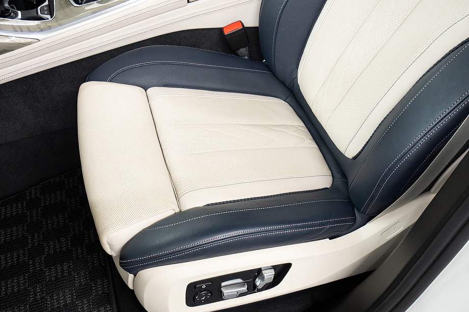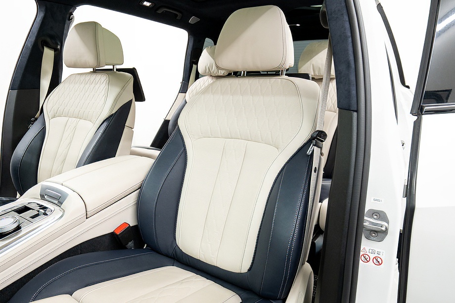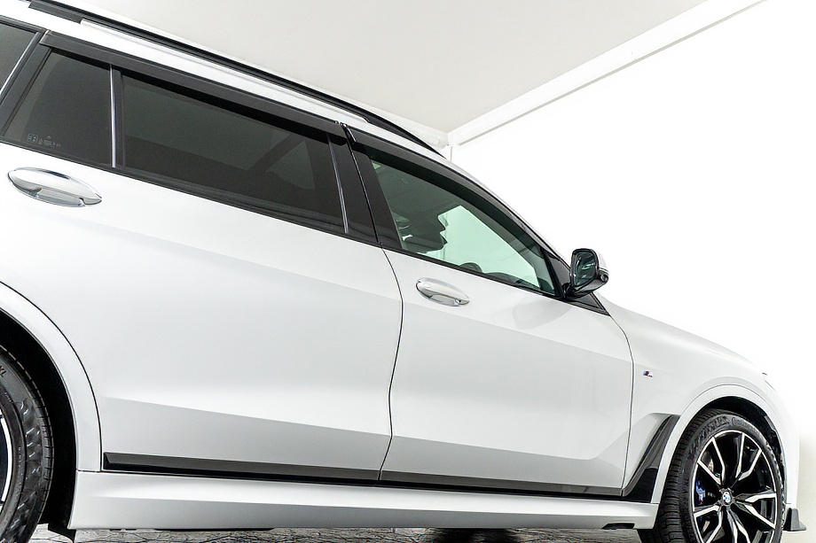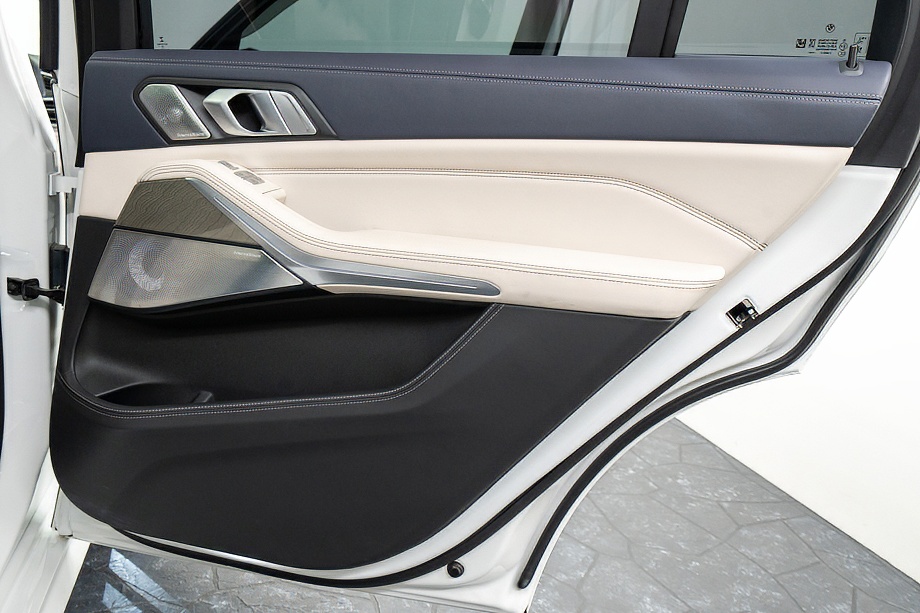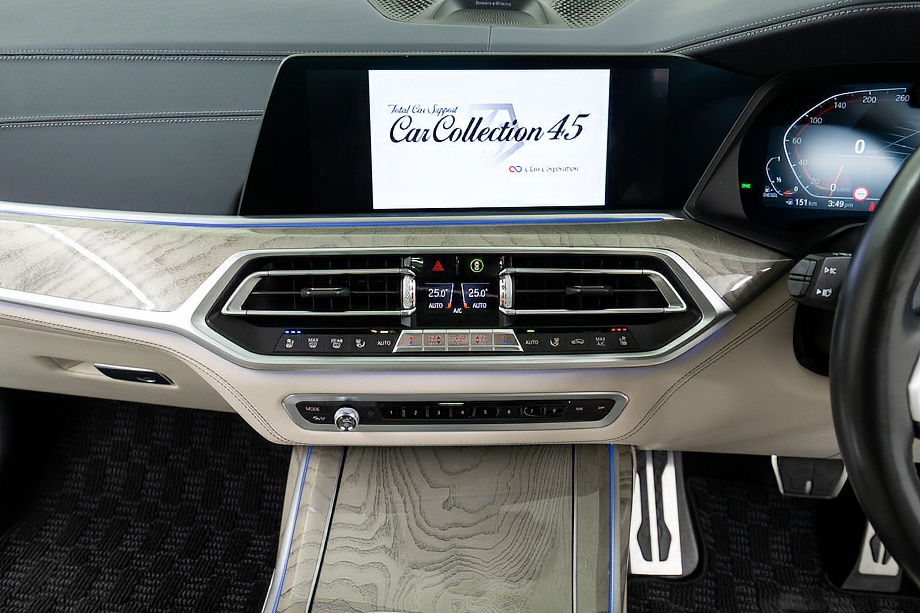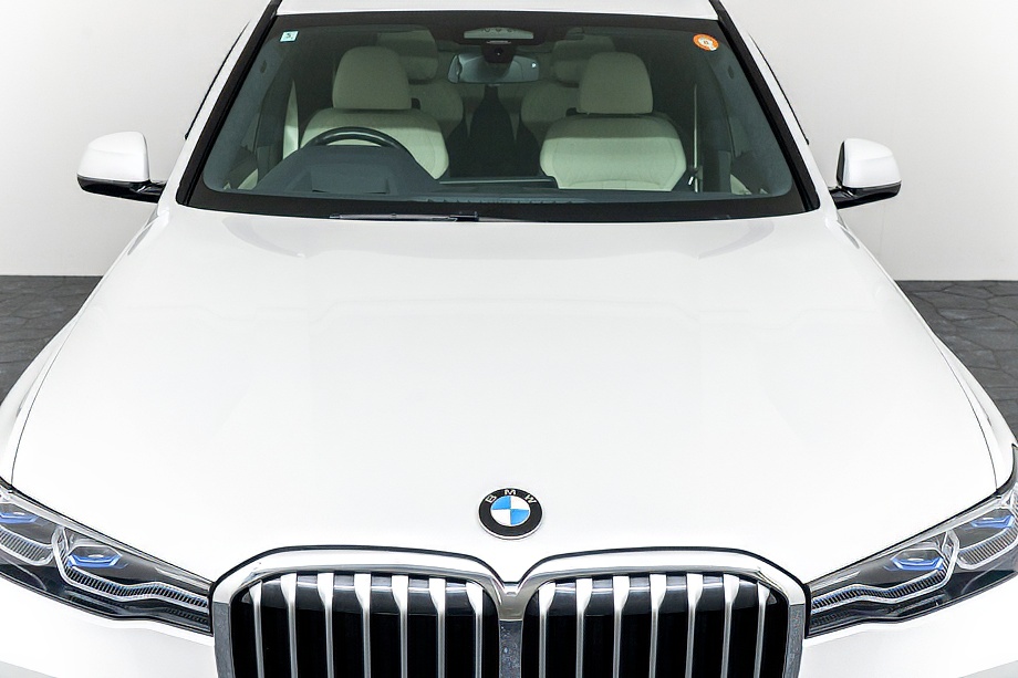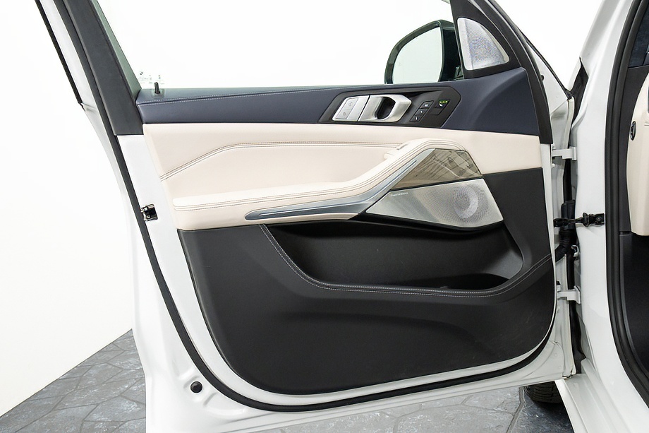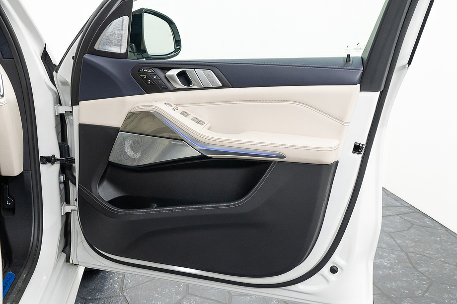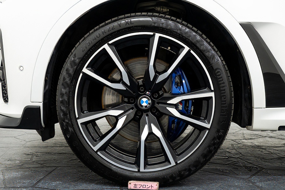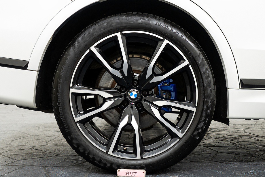 まず目を引くのは、ミネラルホワイトのボディに映える堂々たる佇まい。全長5メートルを超える存在感に、Mスポーツならではの引き締まったエアロデザイン、そしてオプションの22インチMライト・アロイ・ホイールが加わることで、ただ大きいだけではない「洗練された迫力」を感じさせてくれます。社外フロントスポイラーもさりげなく個性を演出し、街中でも高速道路でも視線を集める一台です。