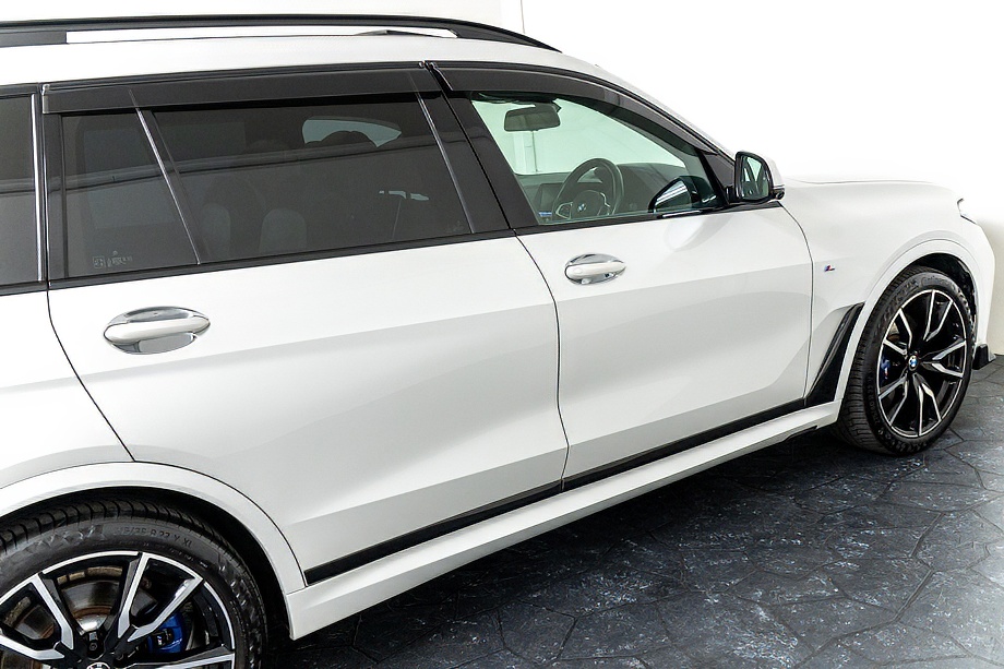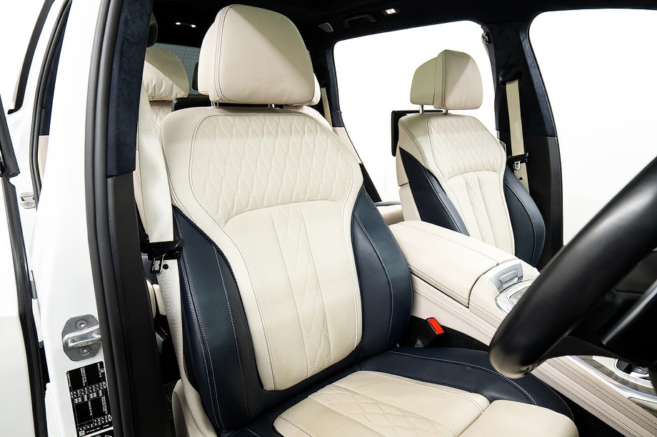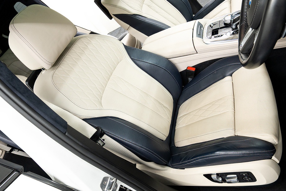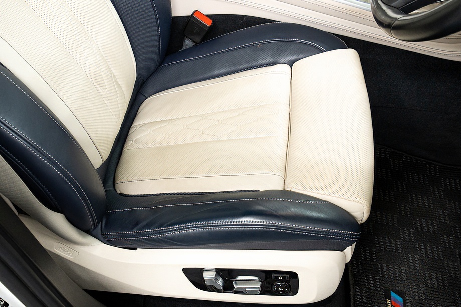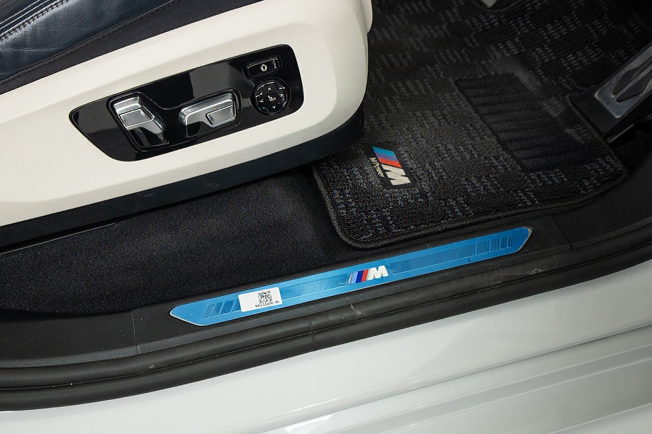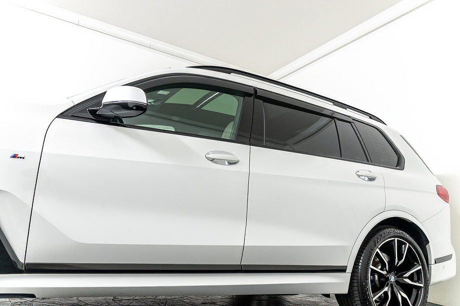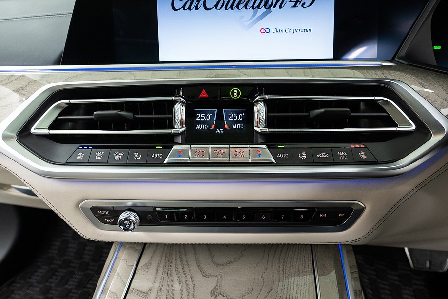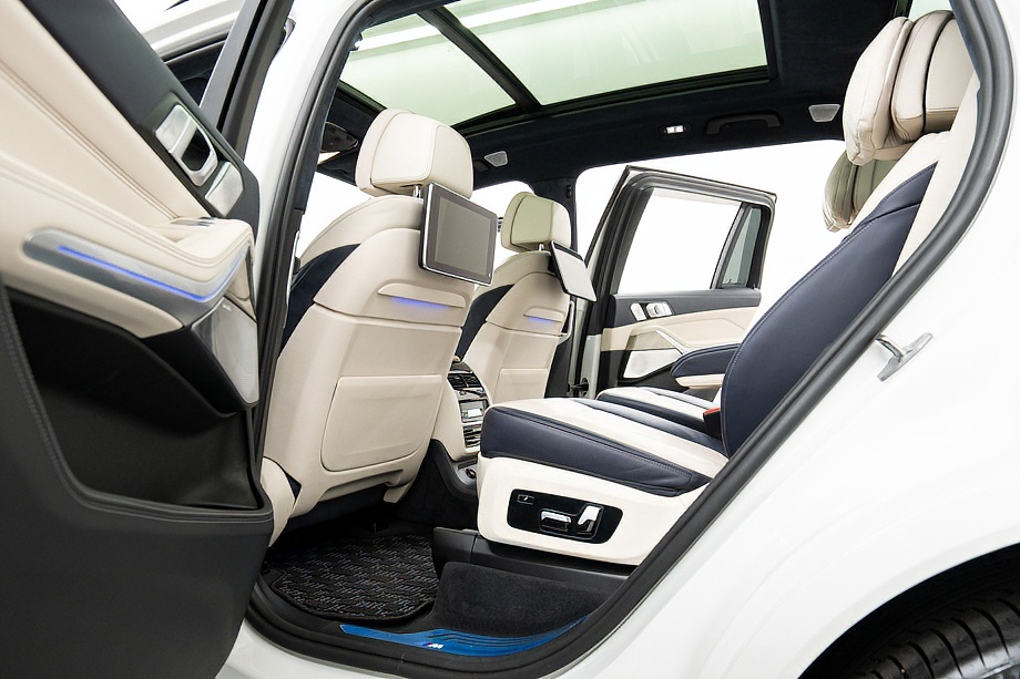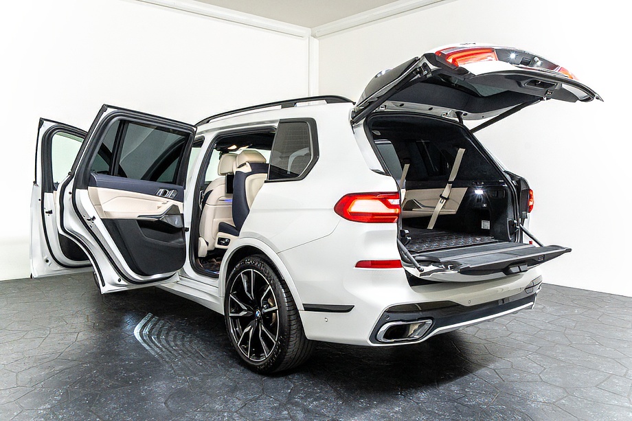 まず目を引くのは、ミネラルホワイトのボディに映える堂々たる佇まい。全長5メートルを超える存在感に、Mスポーツならではの引き締まったエアロデザイン、そしてオプションの22インチMライト・アロイ・ホイールが加わることで、ただ大きいだけではない「洗練された迫力」を感じさせてくれます。社外フロントスポイラーもさりげなく個性を演出し、街中でも高速道路でも視線を集める一台です。