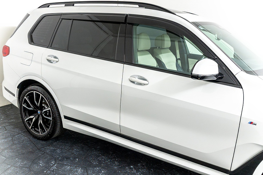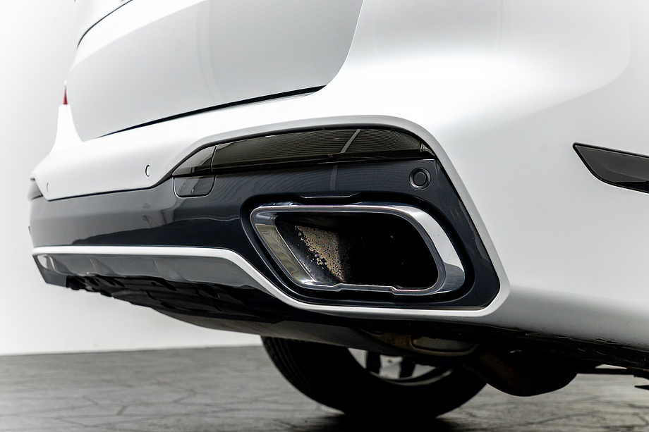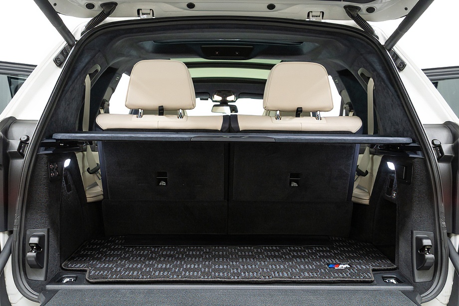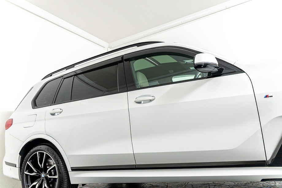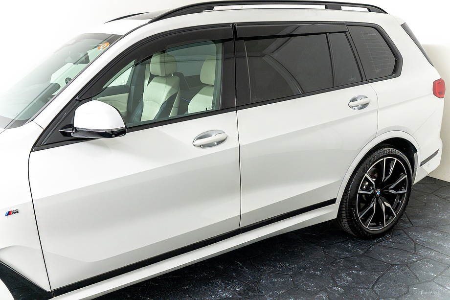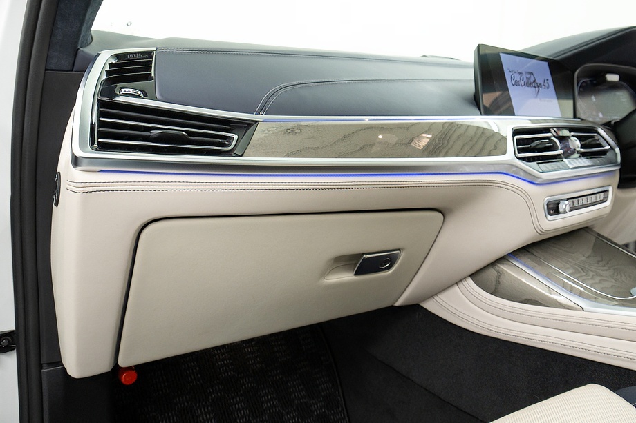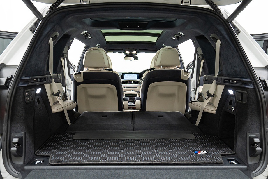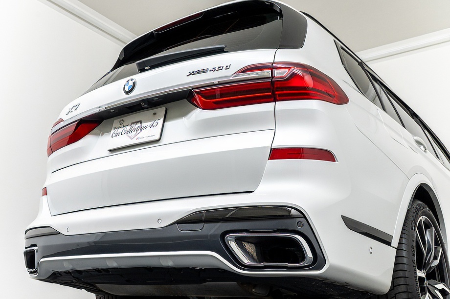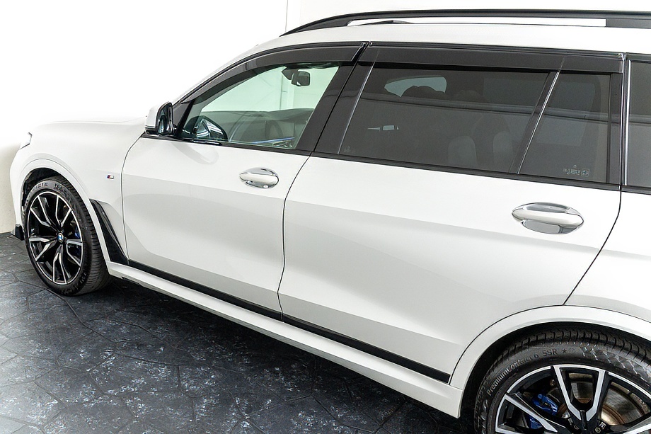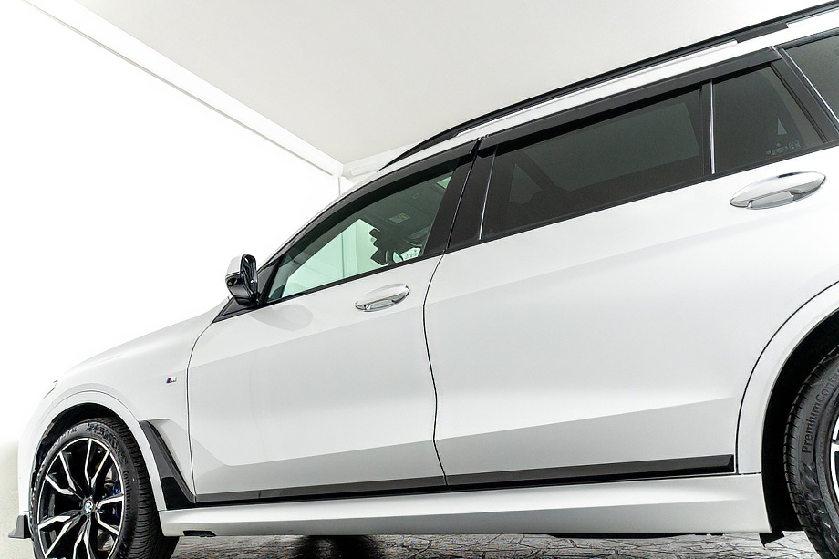 まず目を引くのは、ミネラルホワイトのボディに映える堂々たる佇まい。全長5メートルを超える存在感に、Mスポーツならではの引き締まったエアロデザイン、そしてオプションの22インチMライト・アロイ・ホイールが加わることで、ただ大きいだけではない「洗練された迫力」を感じさせてくれます。社外フロントスポイラーもさりげなく個性を演出し、街中でも高速道路でも視線を集める一台です。