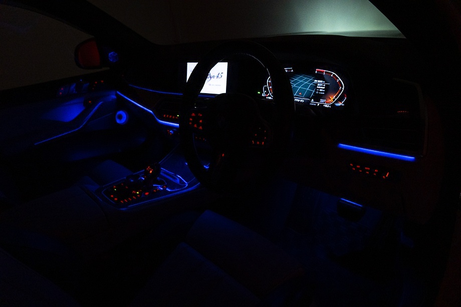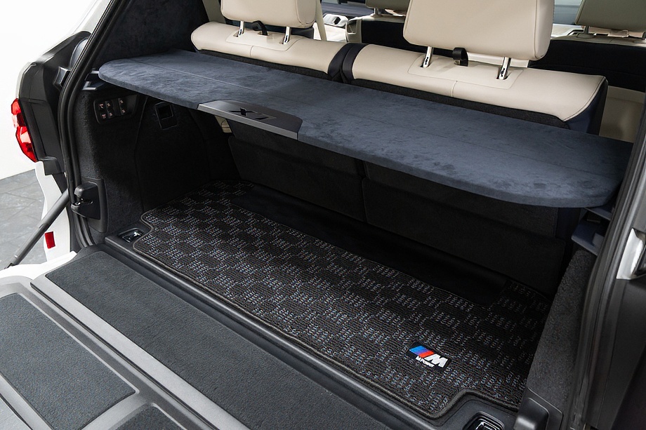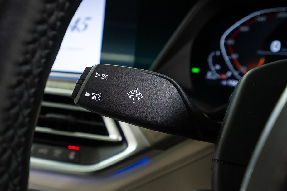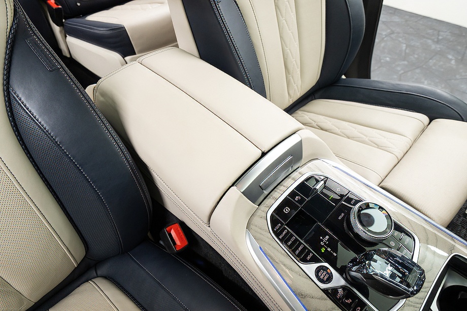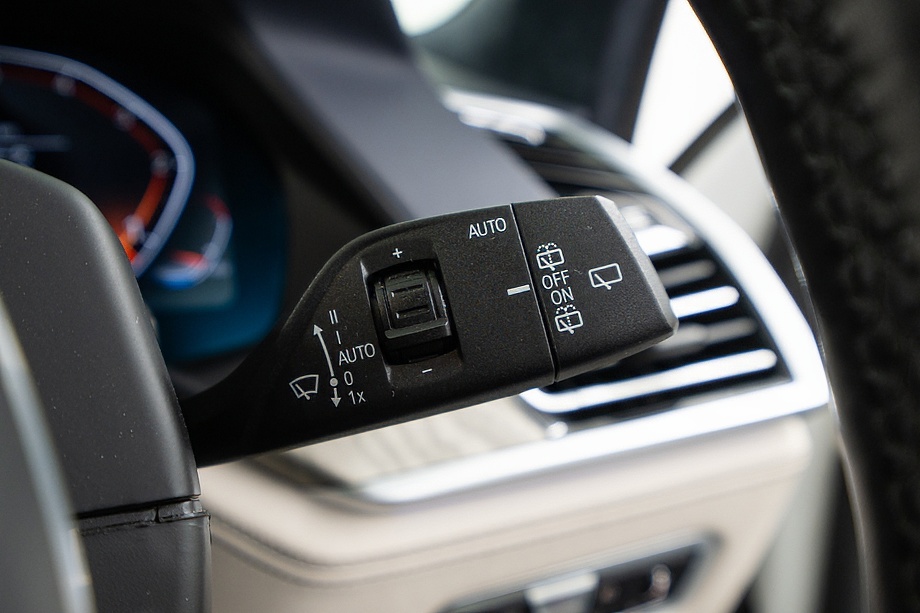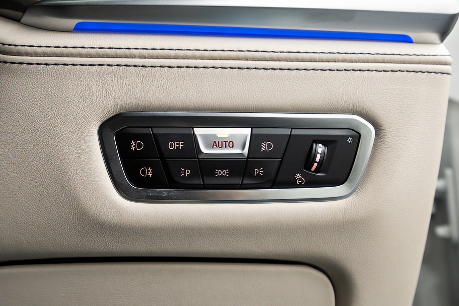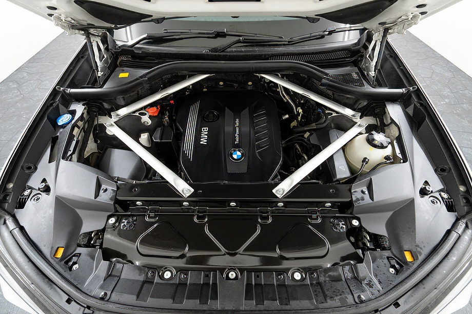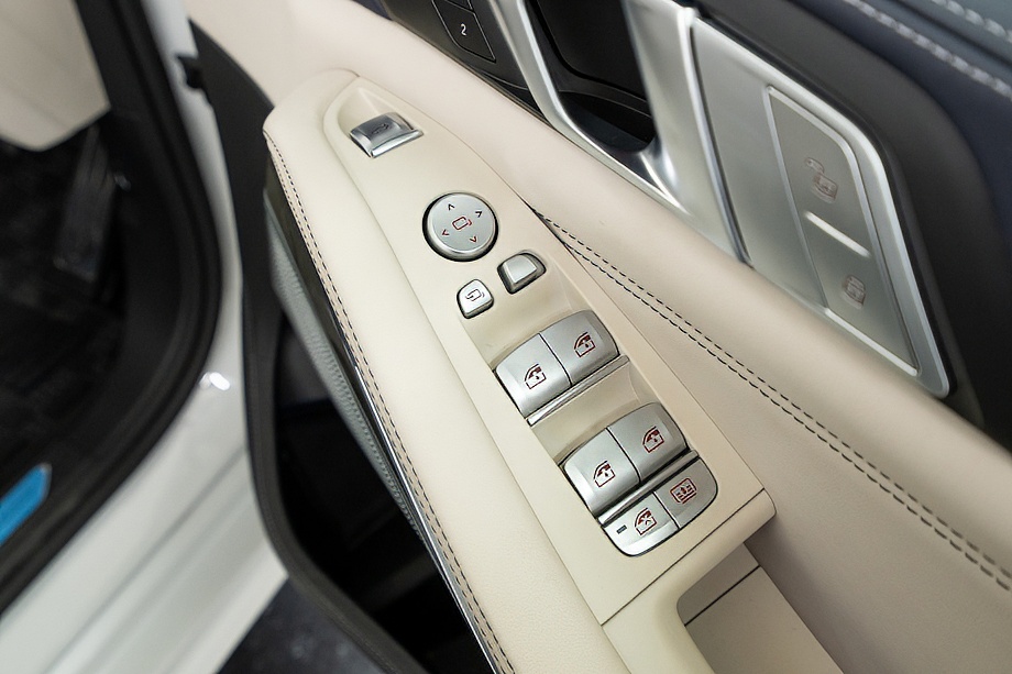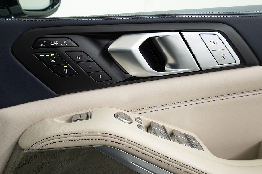 まず目を引くのは、ミネラルホワイトのボディに映える堂々たる佇まい。全長5メートルを超える存在感に、Mスポーツならではの引き締まったエアロデザイン、そしてオプションの22インチMライト・アロイ・ホイールが加わることで、ただ大きいだけではない「洗練された迫力」を感じさせてくれます。社外フロントスポイラーもさりげなく個性を演出し、街中でも高速道路でも視線を集める一台です。