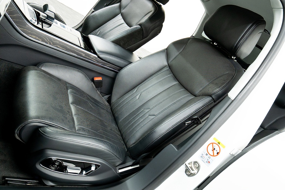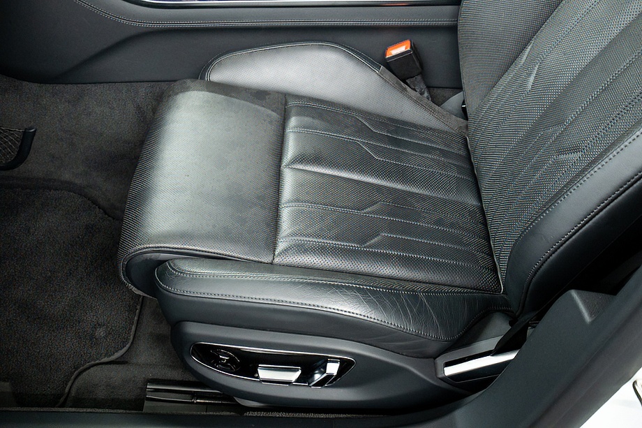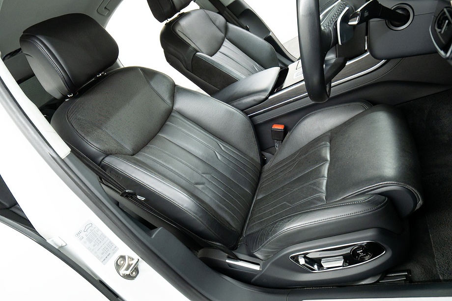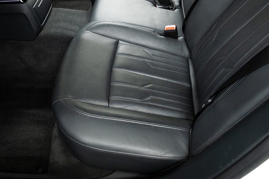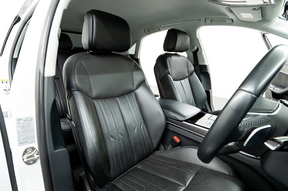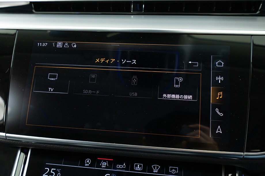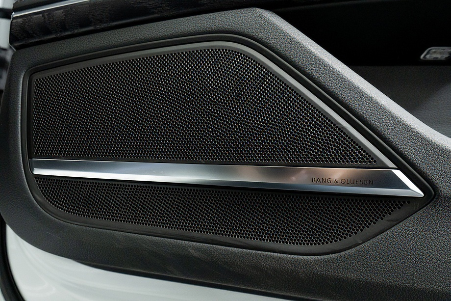 室内に足を踏み入れると、ブラックレザーシートの質感と、アンビエントライトの柔らかな光が迎えてくれます。シートヒーター&クーラー付きなので、季節を問わず快適。さらにバング&オルフセンのサウンドシステムが、車内をまるで上質な音楽空間のように変えてくれます。フルセグTV、USB、SD、Bluetooth対応で、使い勝手も申し分ありません。
