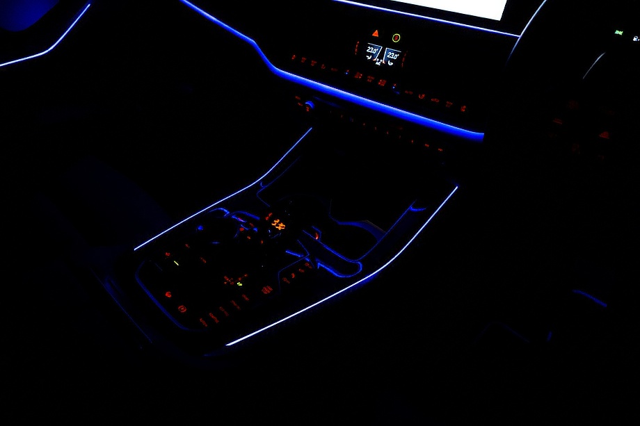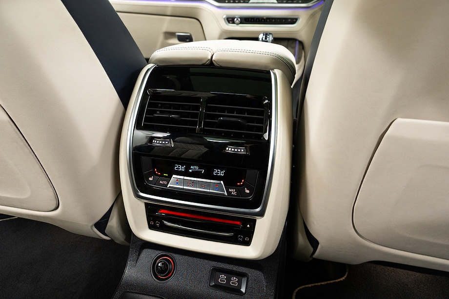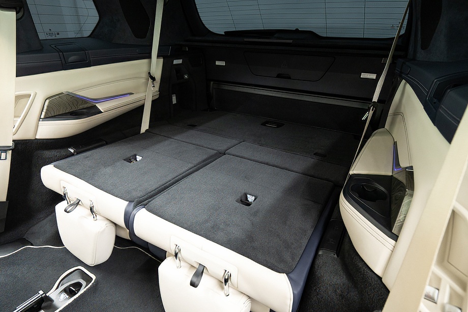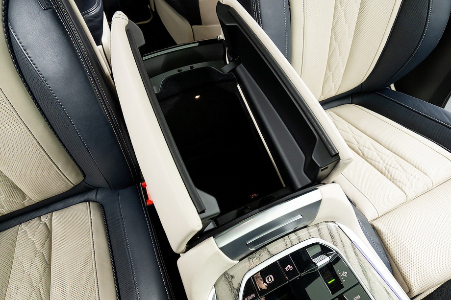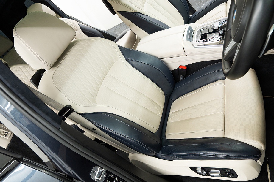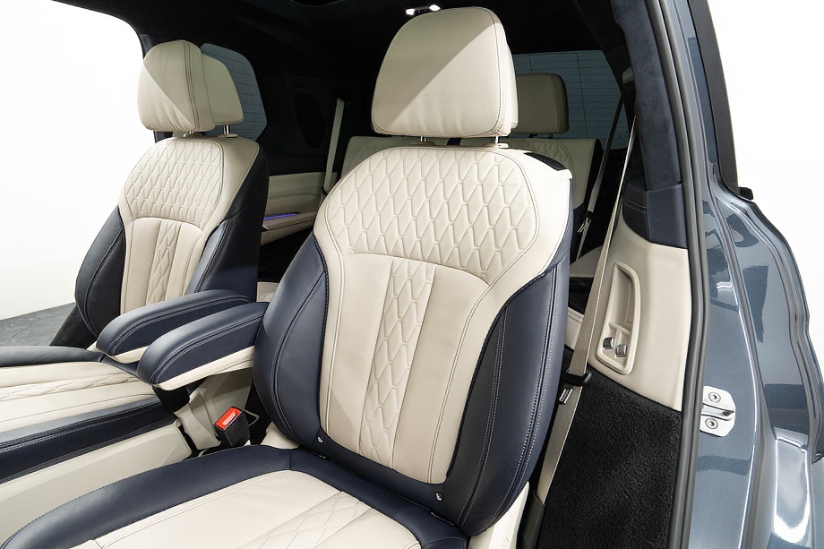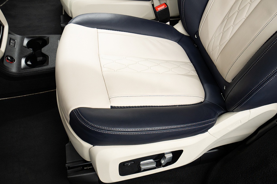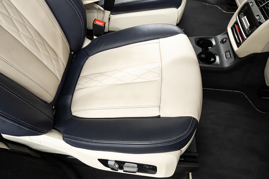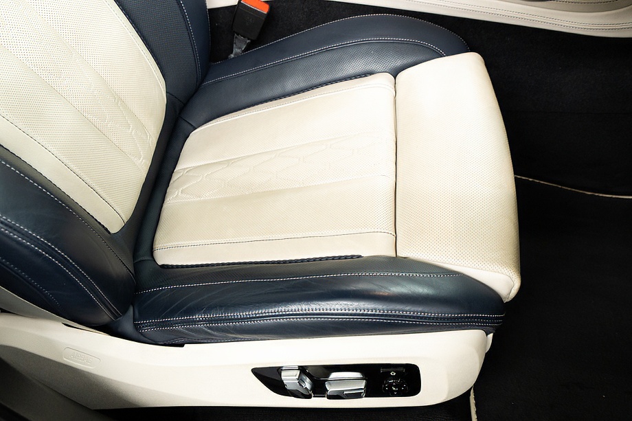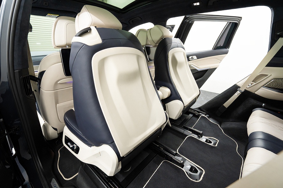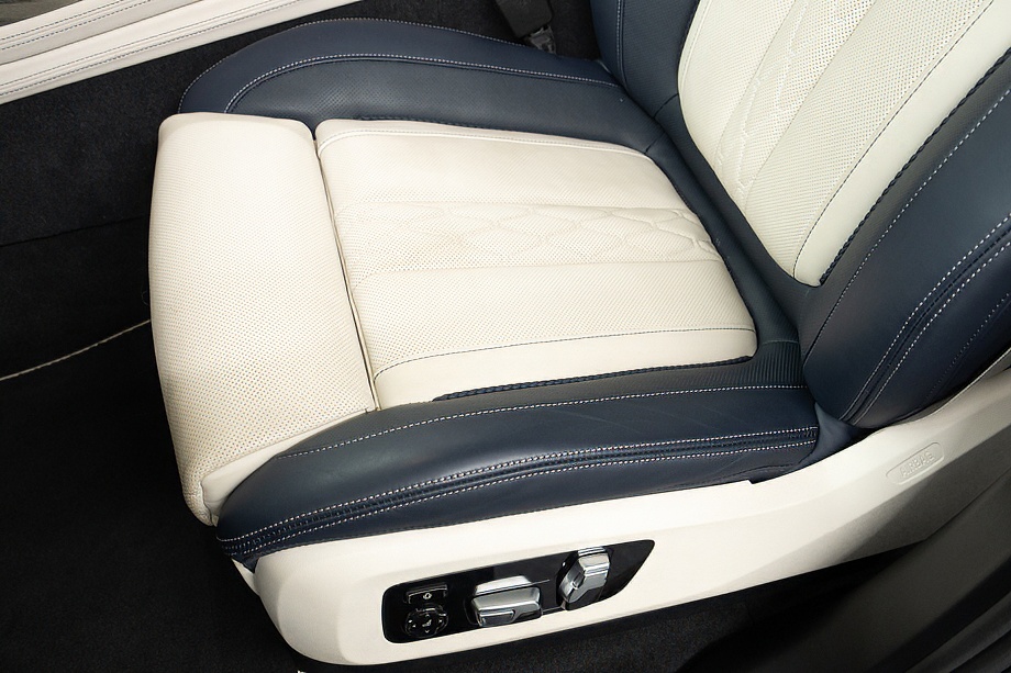 アイボリーホワイト×ミッドナイトブルーのインテリアは明るく上質で、乗る人すべてをやさしく包み込みます。シートにはヒーター、クーラー、そしてマッサージ機能を完備。長距離ドライブでも疲れを感じさせない、まさに最上級のおもてなしです。