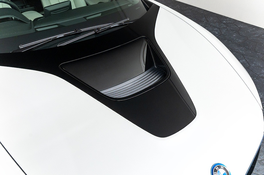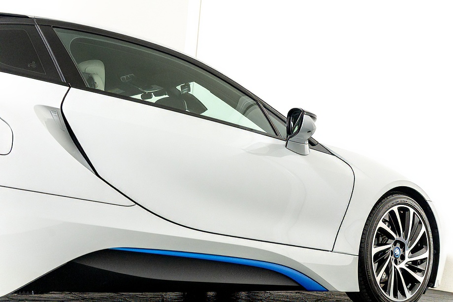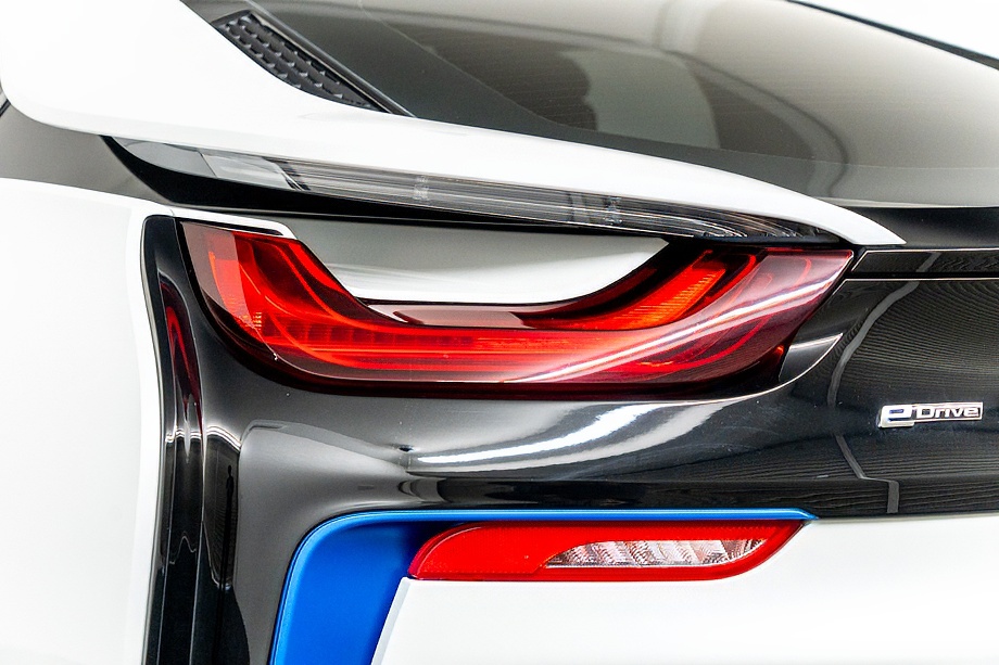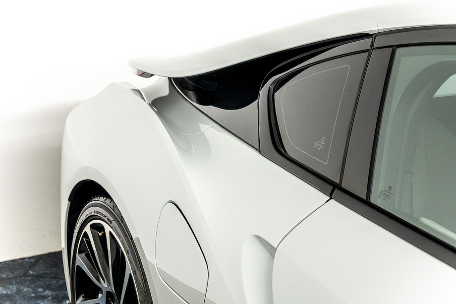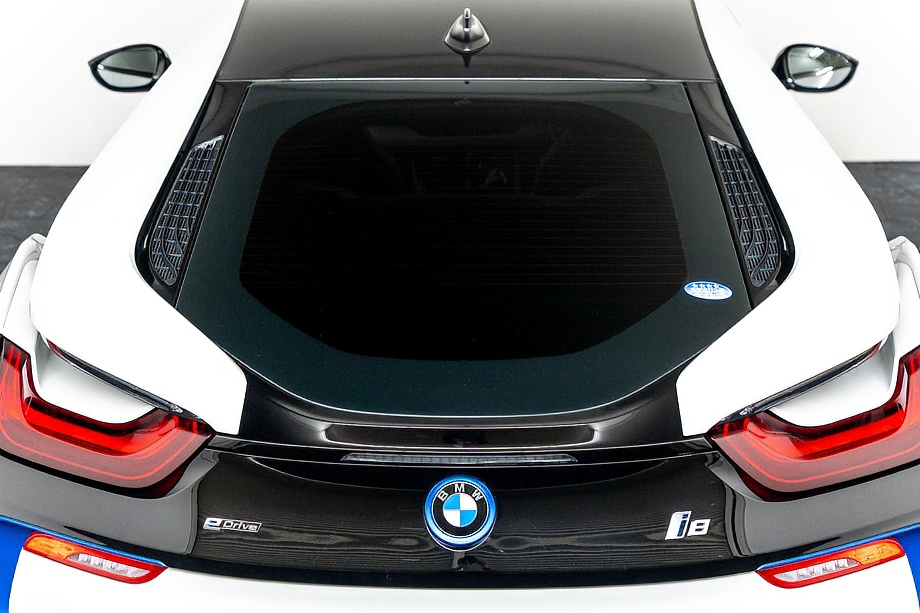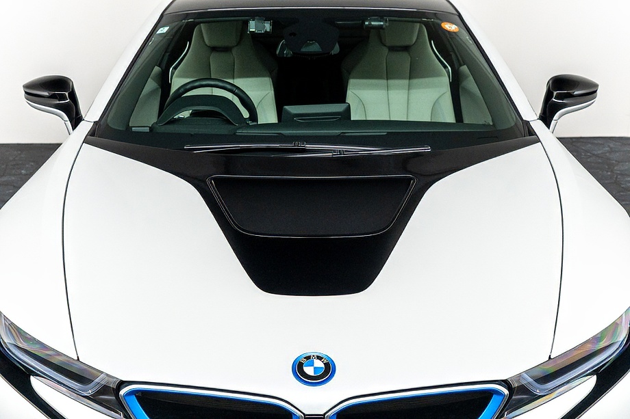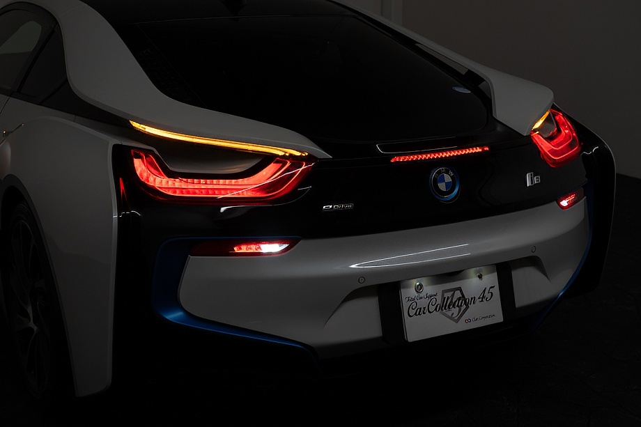 i8のフロントビューは極めて低くかつワイドであり、優れた俊敏性と卓越したエアロダイナミクスを物語ります!!ハイグロスブラック仕上げの特徴的なデザイン「ブラックベルト」は、ボンネット中央部でV字型に浮き上がり、U字型のLEDテールライトを備えたリアエンドへと繋がり、それはエクステリア一連のデザインを視覚的に締めくくる印象的なアクセントになっております!!