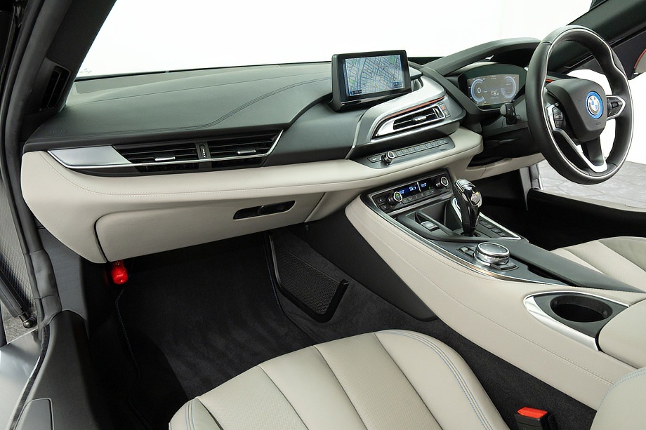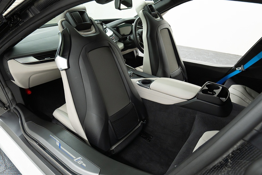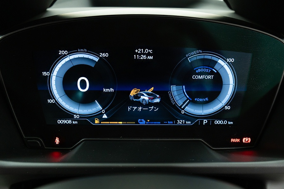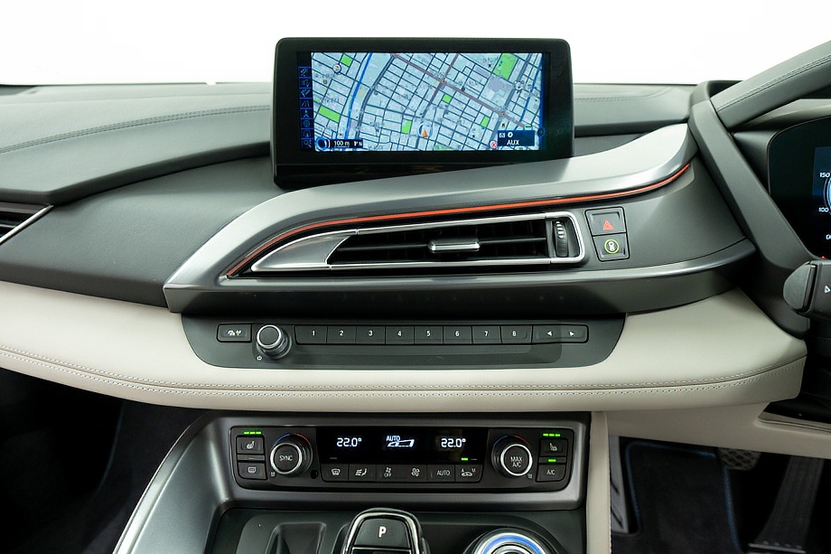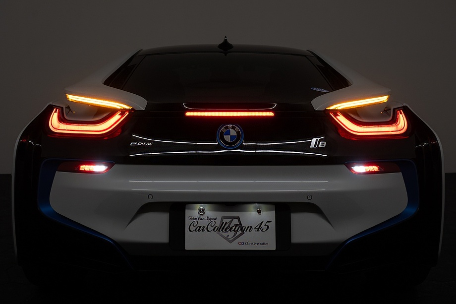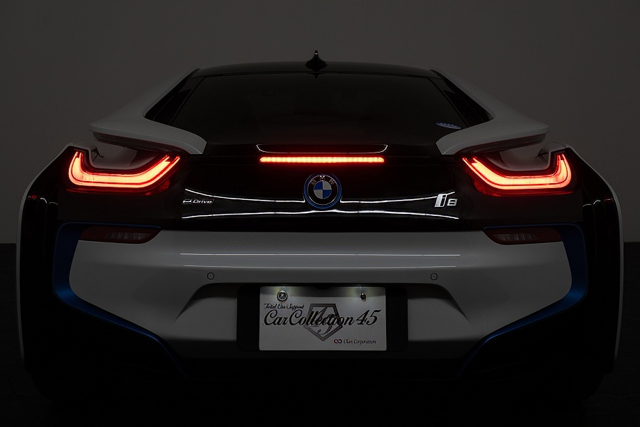 i8は、高性能マシンのスポーツ性を持ちながら、小型車並みの優れた燃費効率を兼ね備えたプラグインハイブリットモデルで、LifeDrive(ライフドライブ)構造と呼ばれる革新的な車体の基本構造コンセプトを採用!LifeDrive(ライフドライブ)構造とは、パワートレインなどを収めるシャシーの役割を果たすアルミニウム製ドライブモジュール及び、乗員などが搭乗する基本骨格(パッセンジャー・セル)となる炭素繊維強化プラスチック(CFRP)製ライフモジュールにより構成され、最大出力170kW/231馬力 最大トルク320Nmを発揮させる直列 3気筒1.5LのBMWツインパワー・ターボ・エンジンを搭載しております!!更に、電気モーターにより定格出力96kW/131馬力、最大トルク250Nmを発生させ、電気モーターのみでの走行の場合、最高速度120km/hまで走行可能で、最長35kmまでゼロ・エミッション電気走行が可能!!