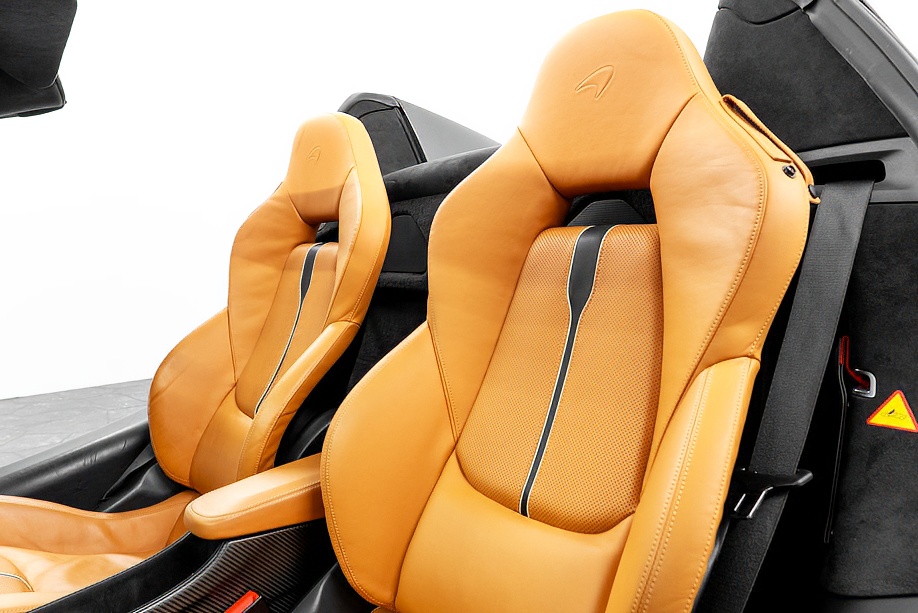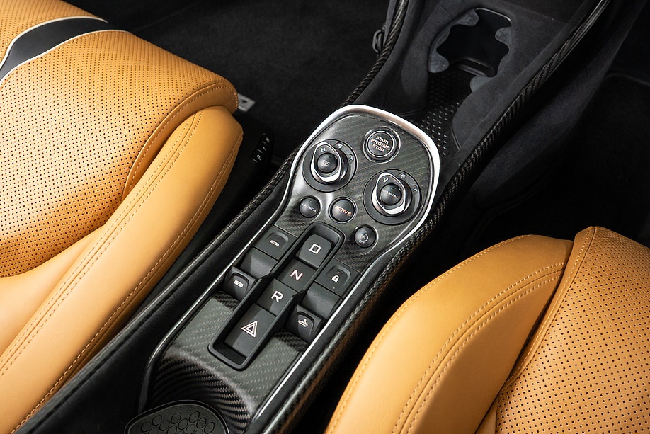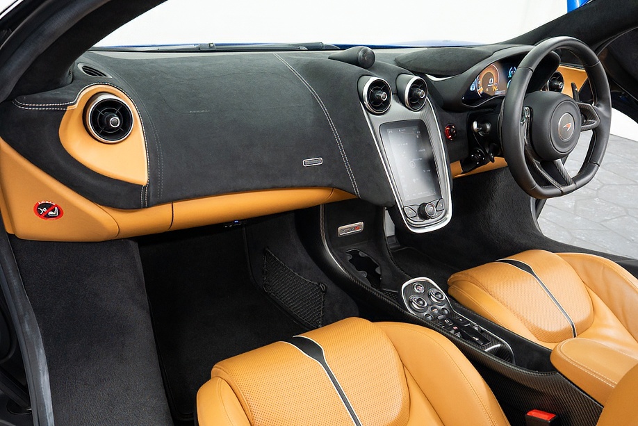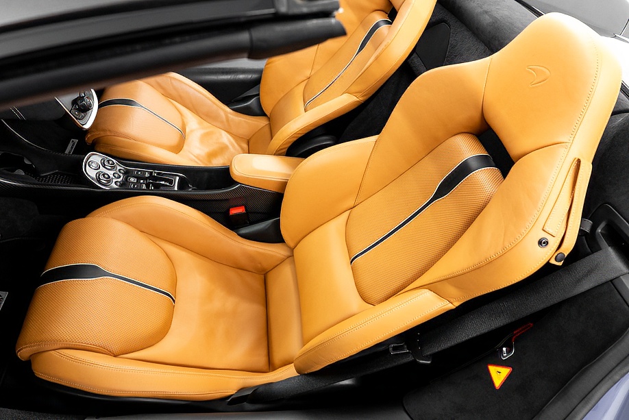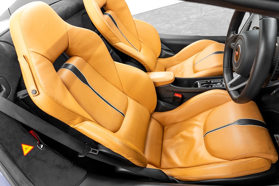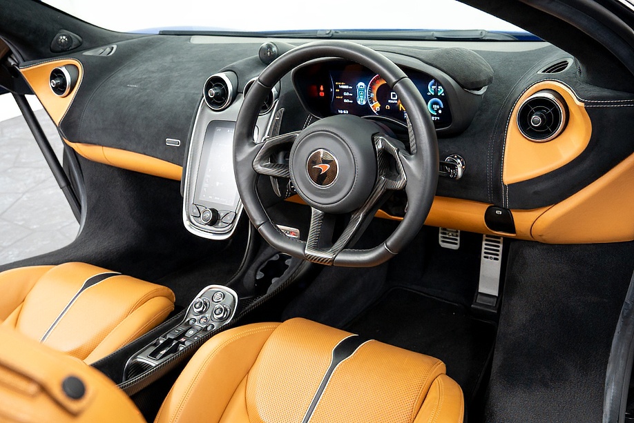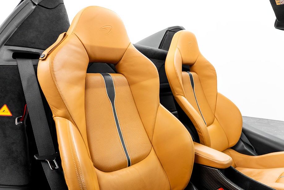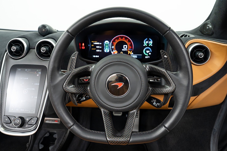 インテリアは “By McLaren Designer Interior” による特別仕立て。キャメルとブラック2トーンのコントラスト、ナッパレザーとアルカンターラのコンビネーション、そして手縫いステッチ……細部まで丁寧に作り込まれたキャビンは、乗り込んだ瞬間に感じる“高級感と個性”が格別です。