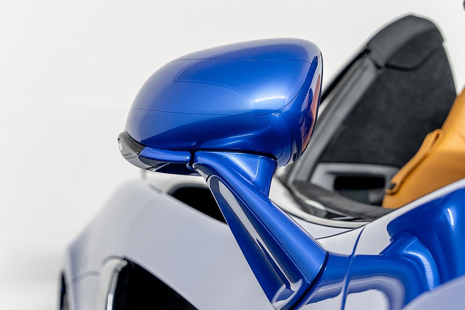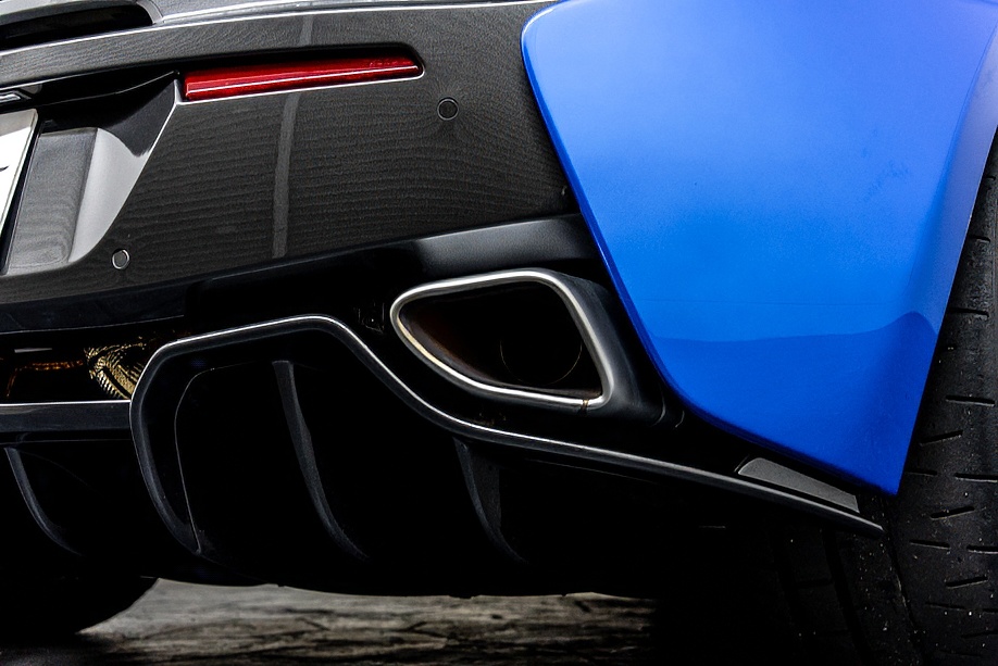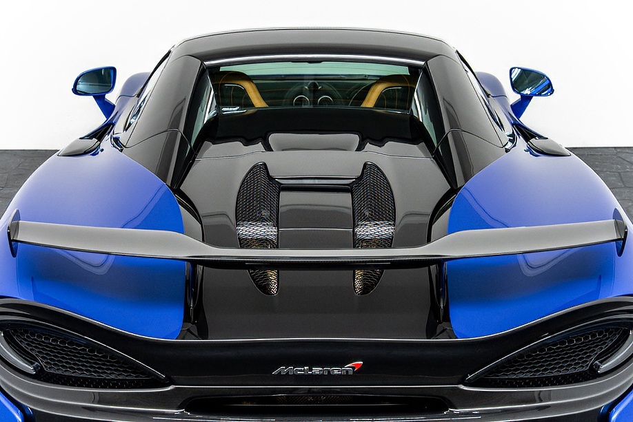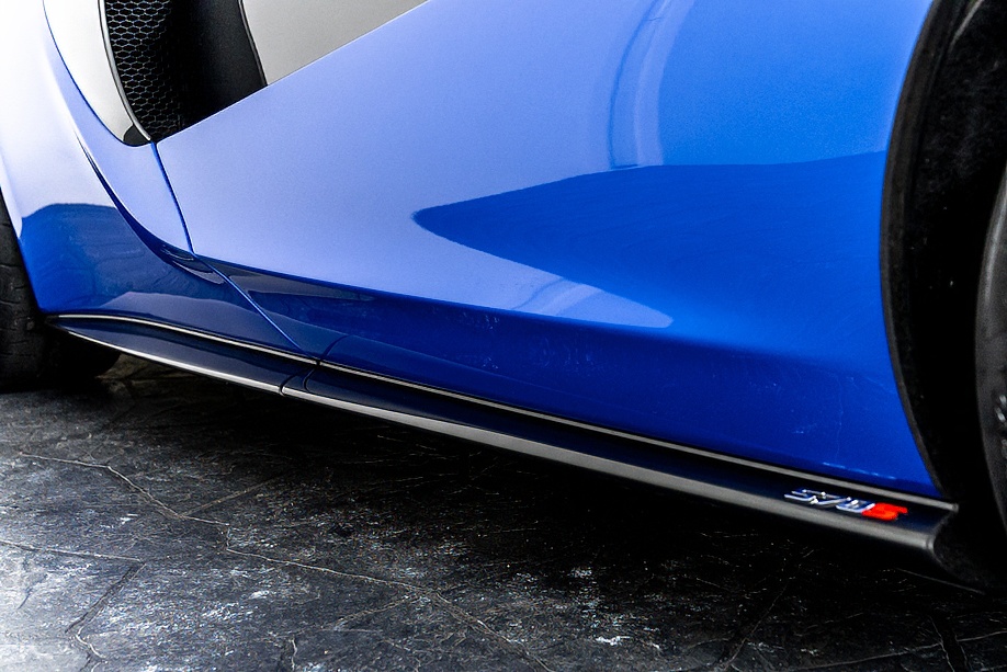 エクステリアの魅力は、ヴェガブルーというエリートペイントの深みと、空力のために計算され尽くしたラインの組み合わせにあります。シャークノーズを思わせるフロント、NACAダクトを彷彿とさせるサイドインテーク、そしてMSOのカーボンウイング。それらがひとつの流れとしてつながることで、ただ“美しい”だけでなく、高速域での安定感をしっかり支えてくれます。