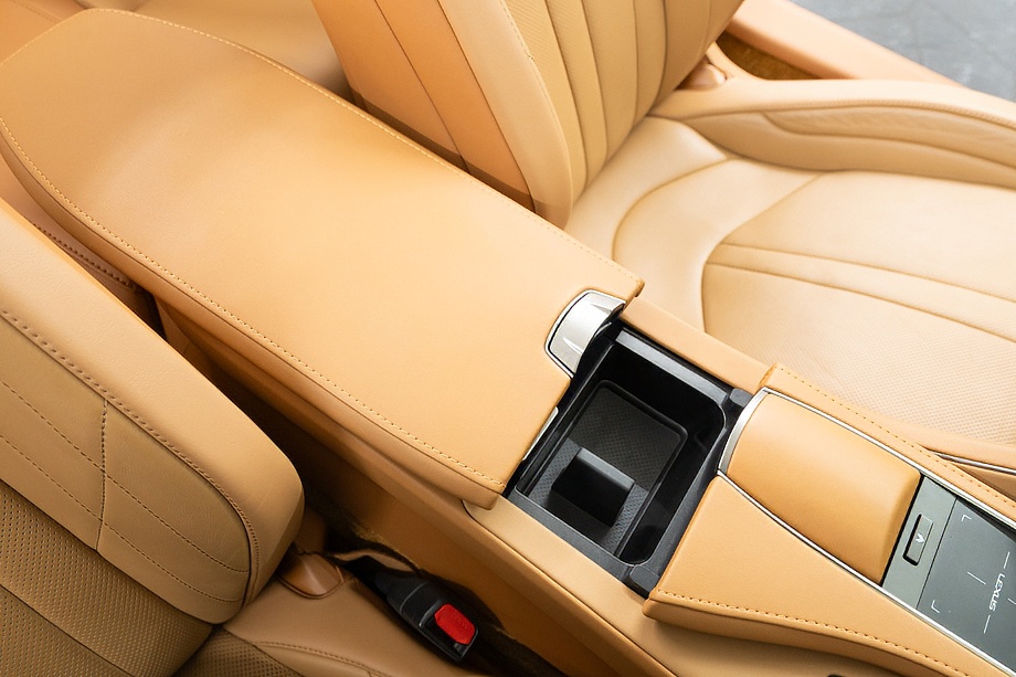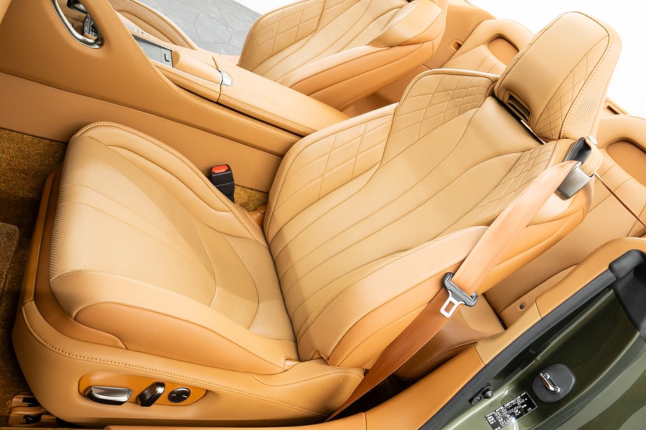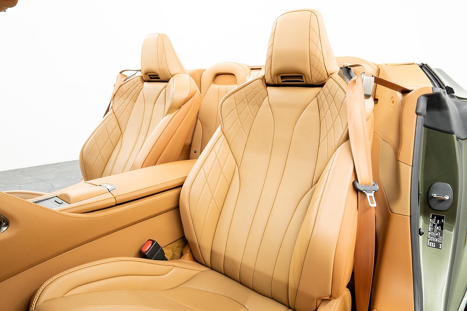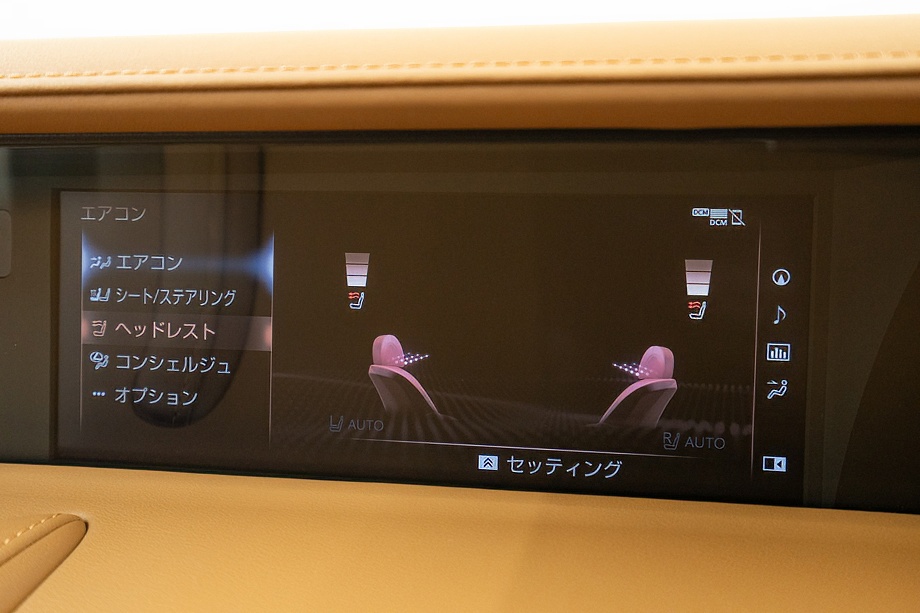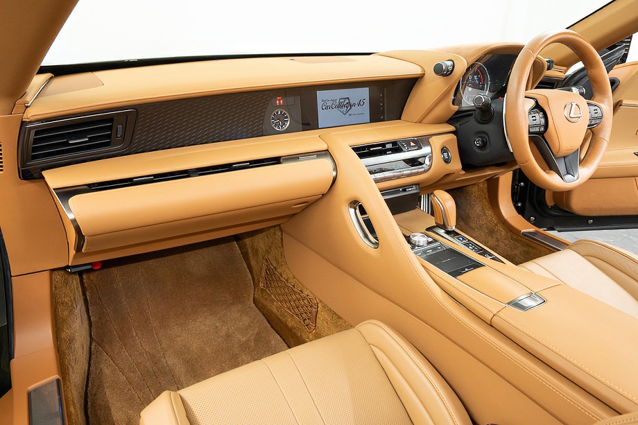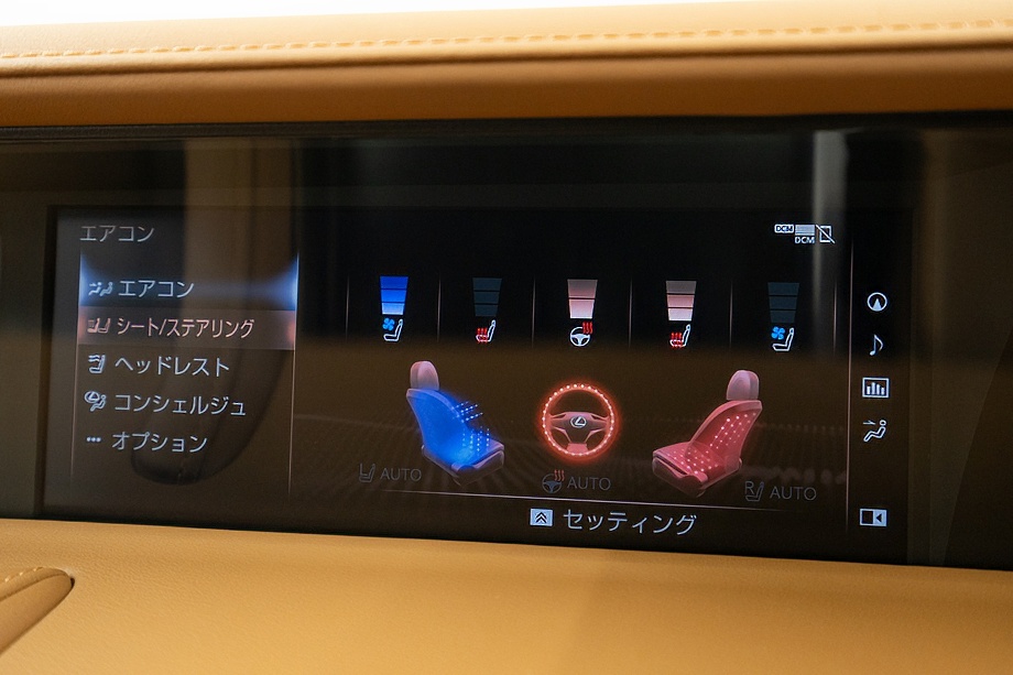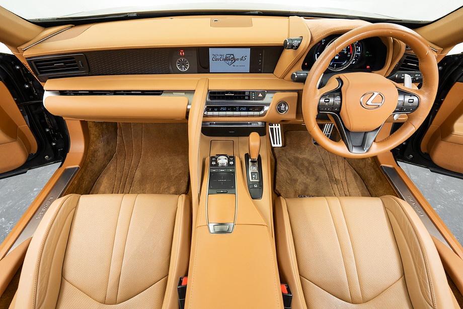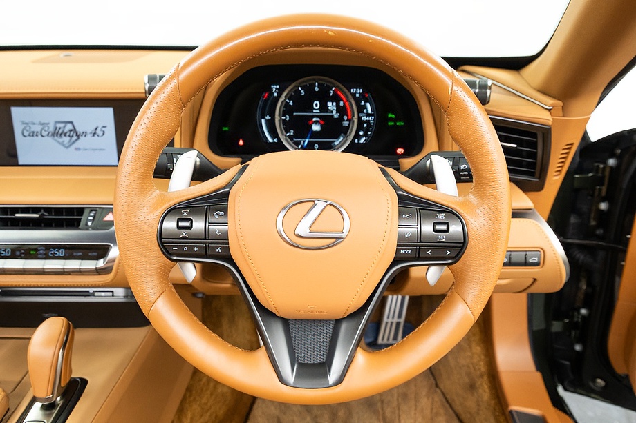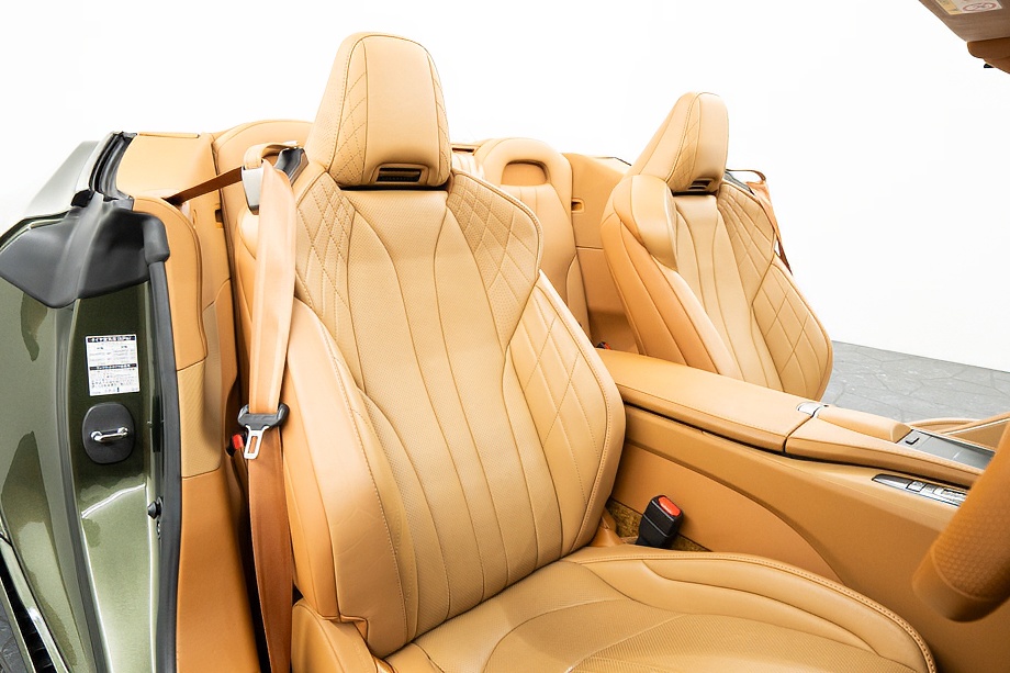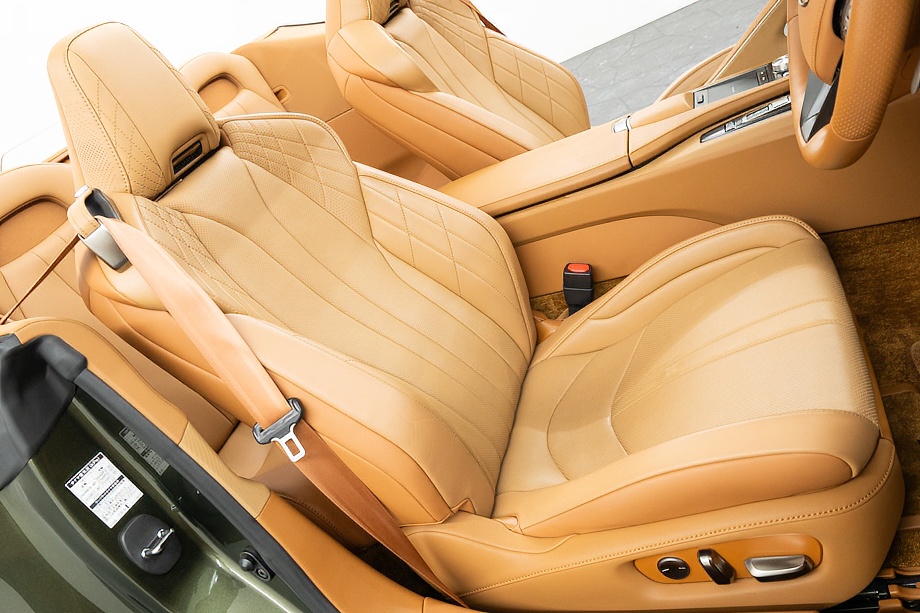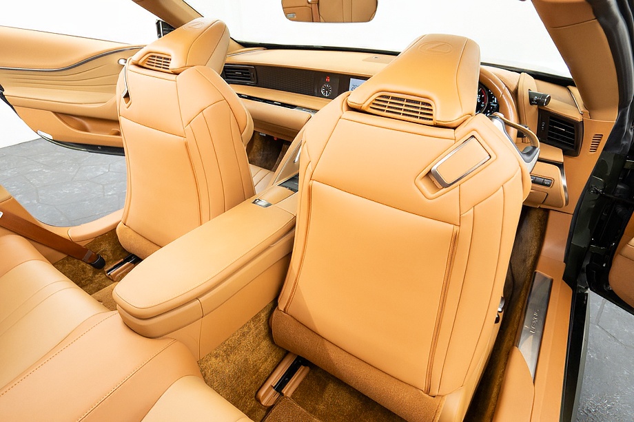 オーカー(キャメル)カラーのセミアニリン本革シートのインテリアでは、シート肩口のキルティングや穴径の異なる3種類のパーフォレーション加工によるグラデーションの表現、ヘッドレストの後部にさりげなく主張するLマークのエンボスなど、ルーフを開けた際の車外からの見え方にこだわり、細部に至るまで作りこみを行ったインテリアとなっております!!これらも、LC500コンバーチブルのコンセプトである「インテリアもエクステリアである」を元にデザインされており、コンバーチブルならではのディティールを作り込んでおります!!走り込みを重ねて、握る際にできる手のひらの窪みとホイール形状がフィットするよう研究された、心地いいグリップ間を感じられるステアリングホイール、優れたホールド性と快適な乗り心地を手に入れ、パフォーマンスを最大限に引き出せるよう設計されたフロントシートなど、ストレスフリーなコックピットが広がっております!!更に、フロントシートにはシートヒーター/ベンチレーション(クーラー)が装備され、夏でも冬でも快適温度になるのが遅いなどの不安も払拭してくれます!!