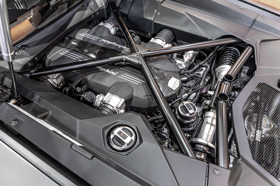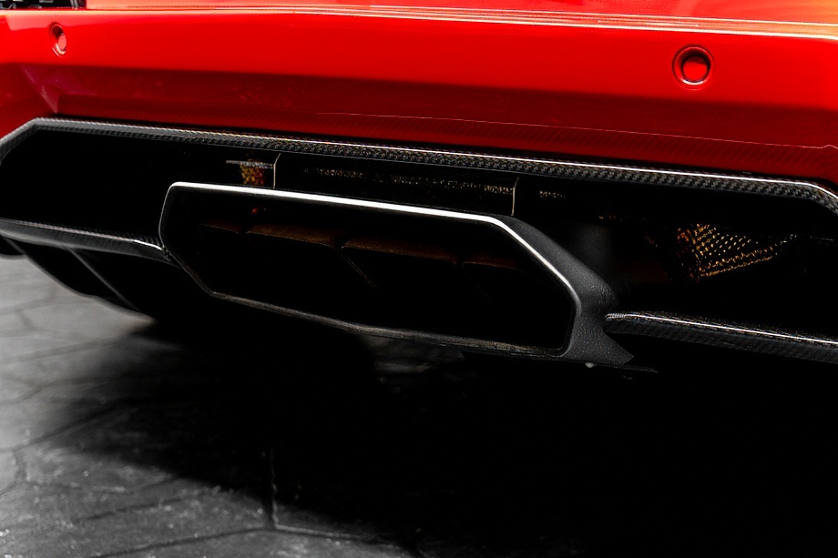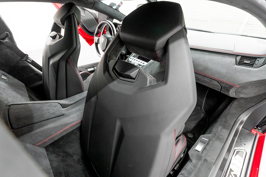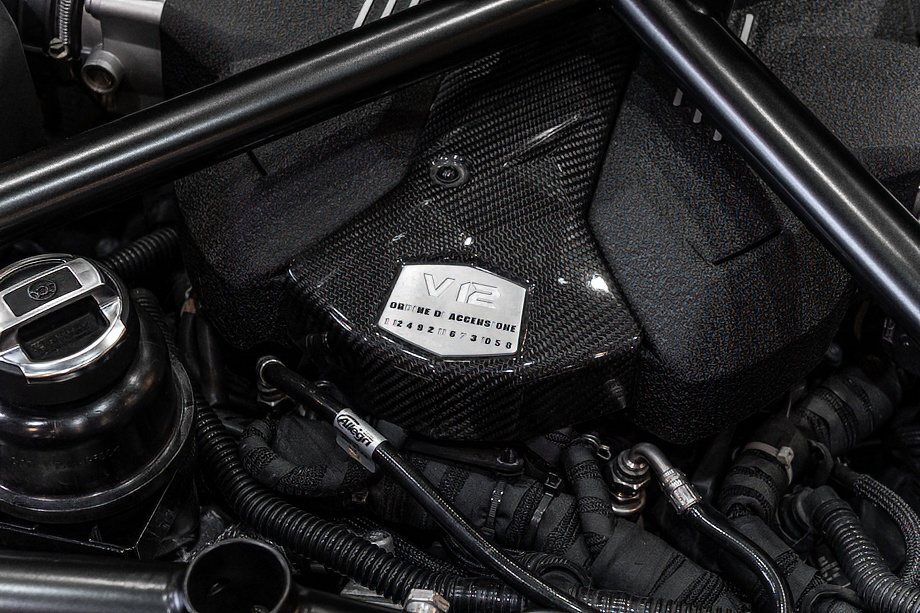 エクステリアは、ロッソマーズのボディカラーにカーボンファイバーが映える、まさに視線を奪う仕上がり。フロントおよびリアのエクステリアカーボンファイバーパッケージに加え、各部に施されたカーボンファイバー製エクステリアディテールが、軽量化と同時に圧倒的な存在感を演出します。クリアエンジンボンネット越しに覗くV12エンジンと、カーボンファイバーエンジンカバーは、所有する歓びを日常的に実感させてくれるポイントです。ディオーネ鍛造リム20/21インチのハイグロスブラックホイールと、レッドキャリパーのカーボンセラミックブレーキが足元を引き締め、機能美と迫力を両立しています。