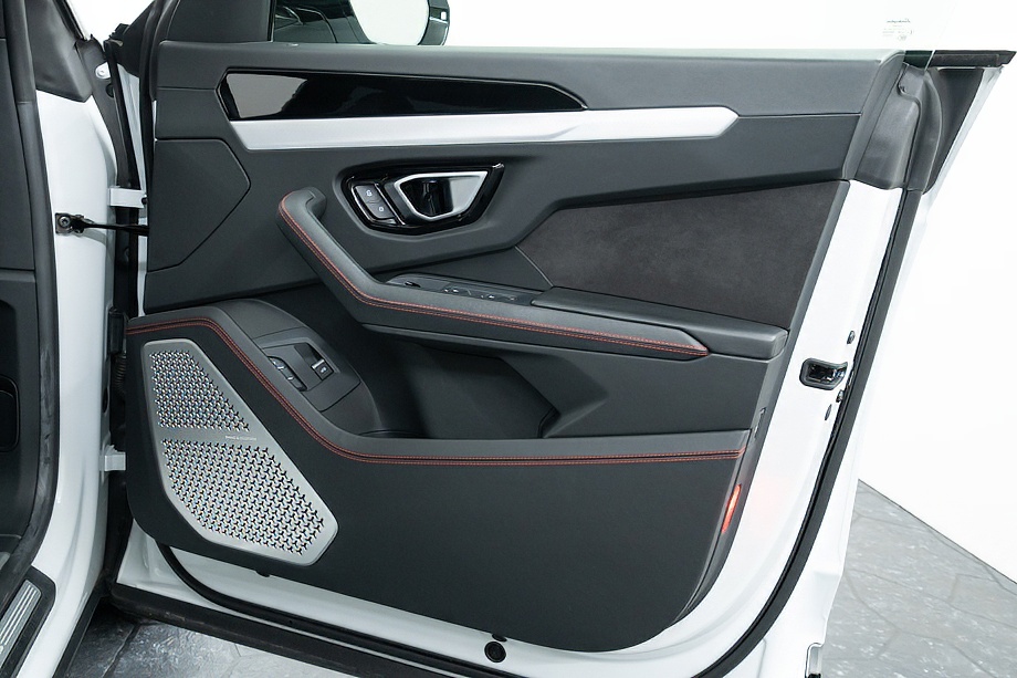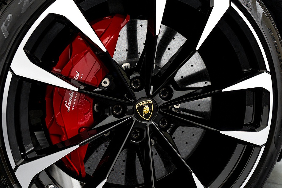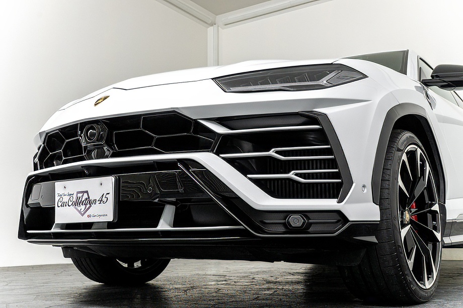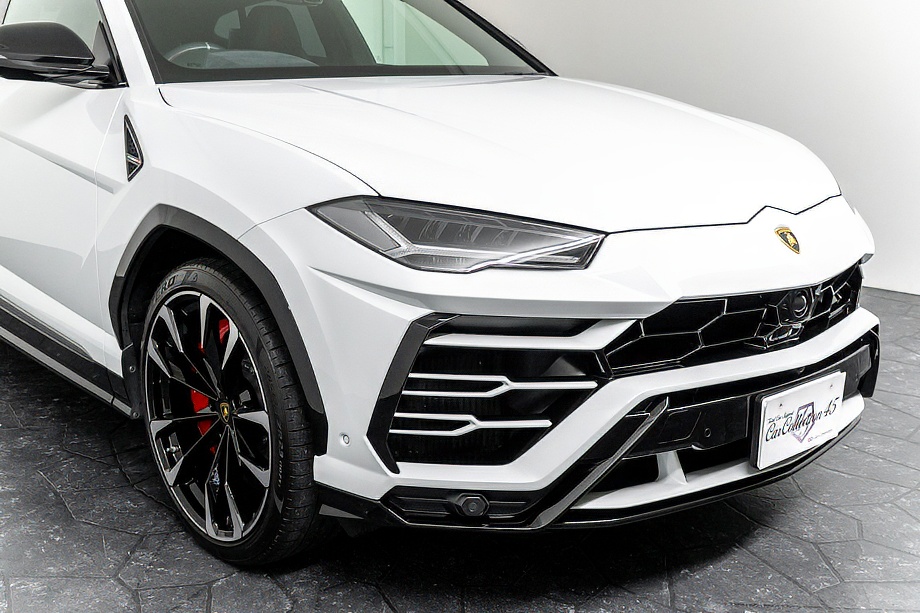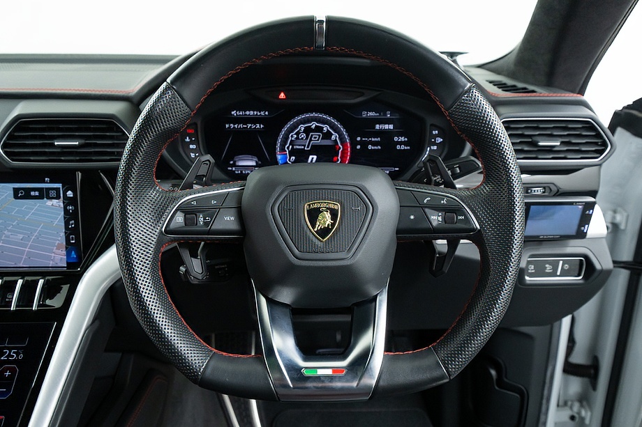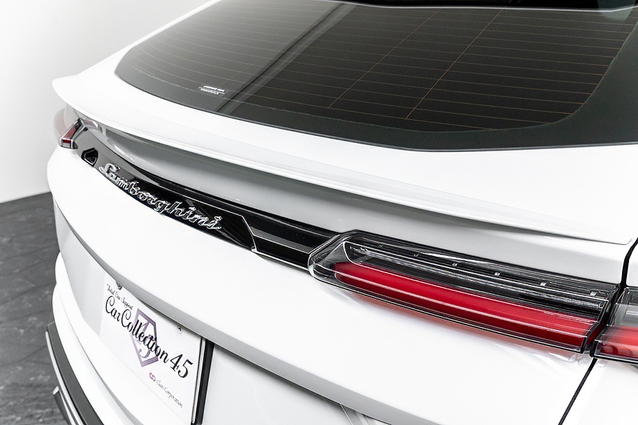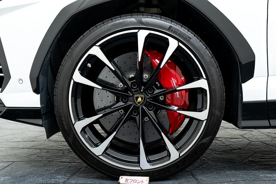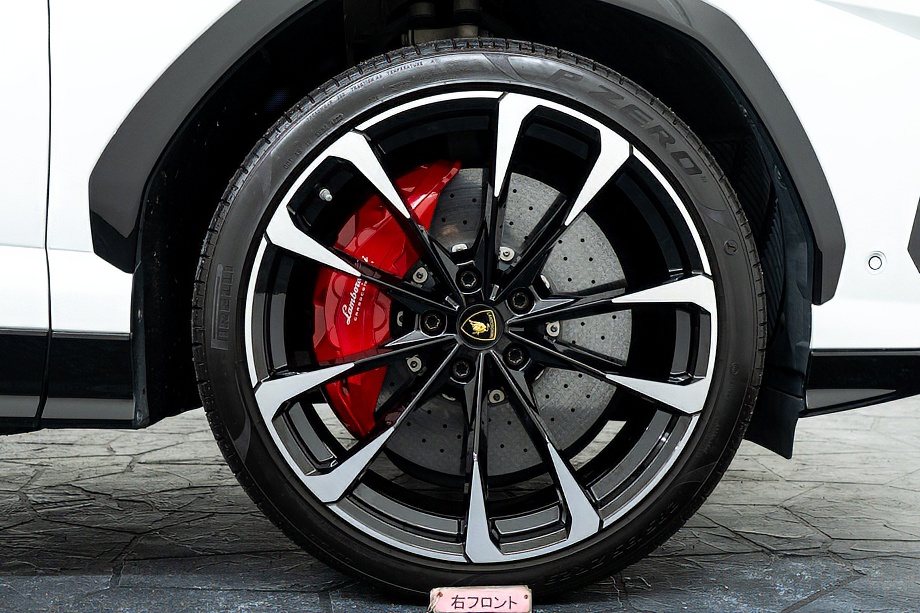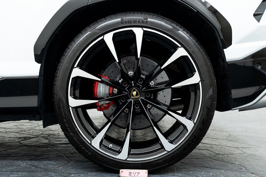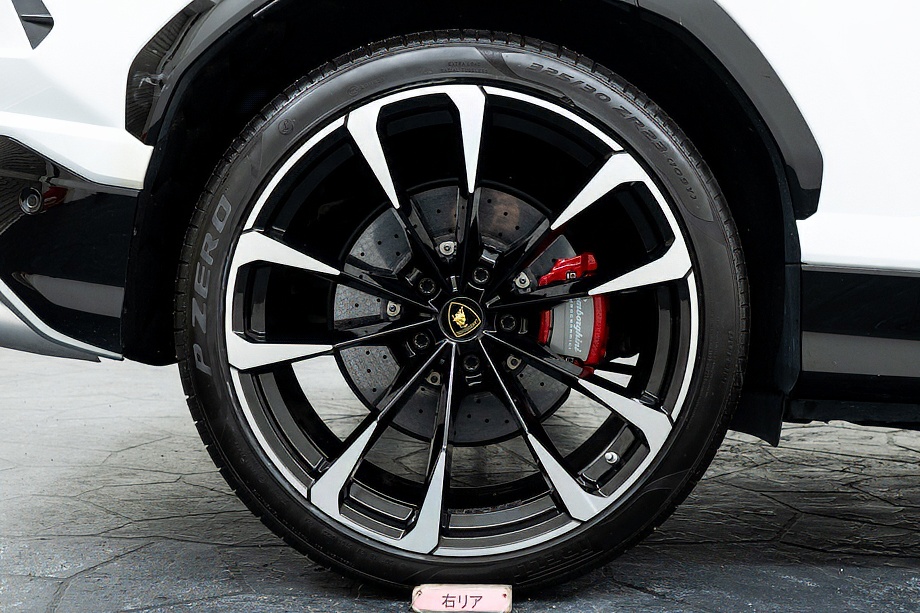 本車両は、存在感あふれるビアンコイカロスのボディカラーに、23インチ「Taigete」ダイヤモンドフィニッシュ鍛造アルミホイールを装着。大径ホイールならではの迫力と、精緻な輝きを放つダイヤモンドカット仕上げが足元を引き締めます。そこに組み合わされるレッドブレーキキャリパーが、さりげなくも力強いアクセントとなり、ランボルギーニらしいスポーティさを際立たせています。さらにブランディングパッケージも備わり、内外装の随所にあしらわれたロゴやディテールが、オーナー様の満足感を一層高めてくれます。