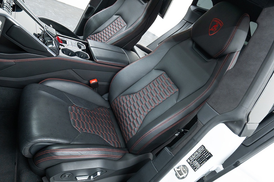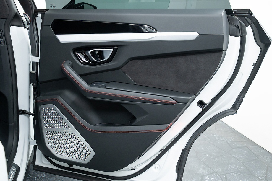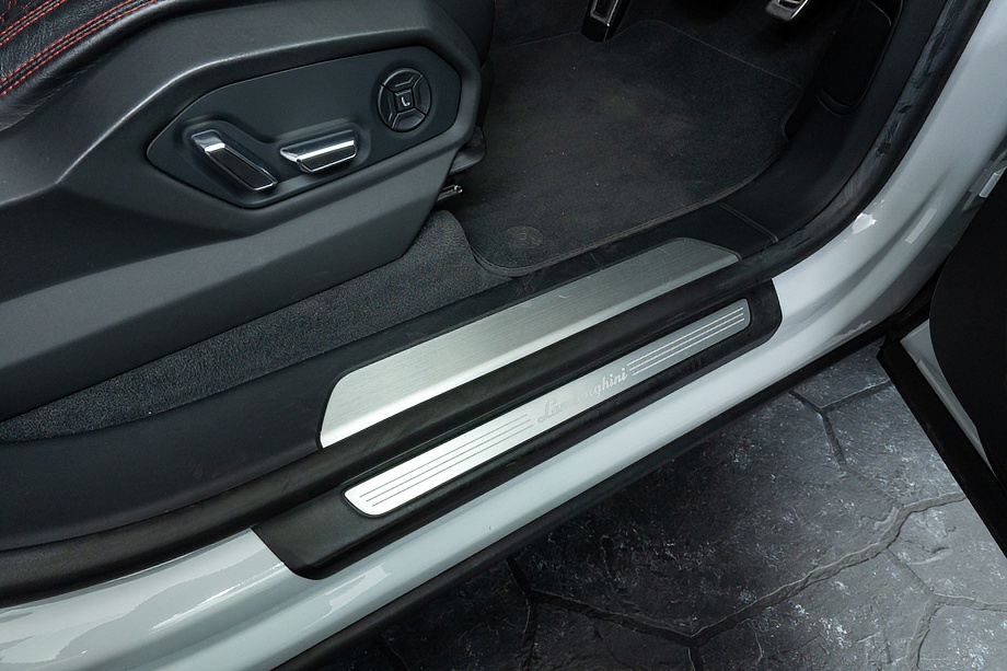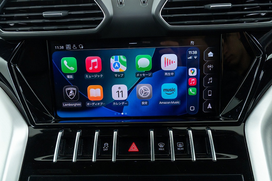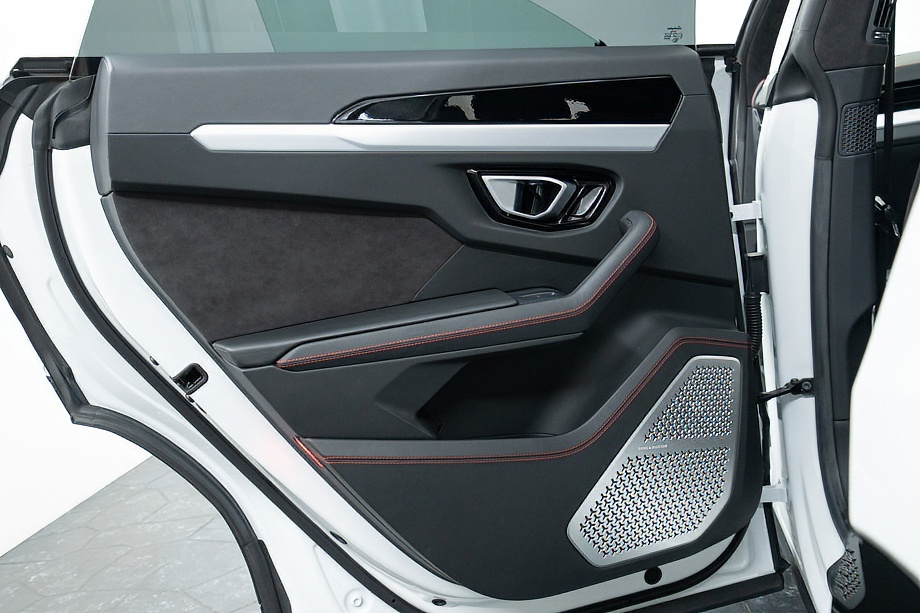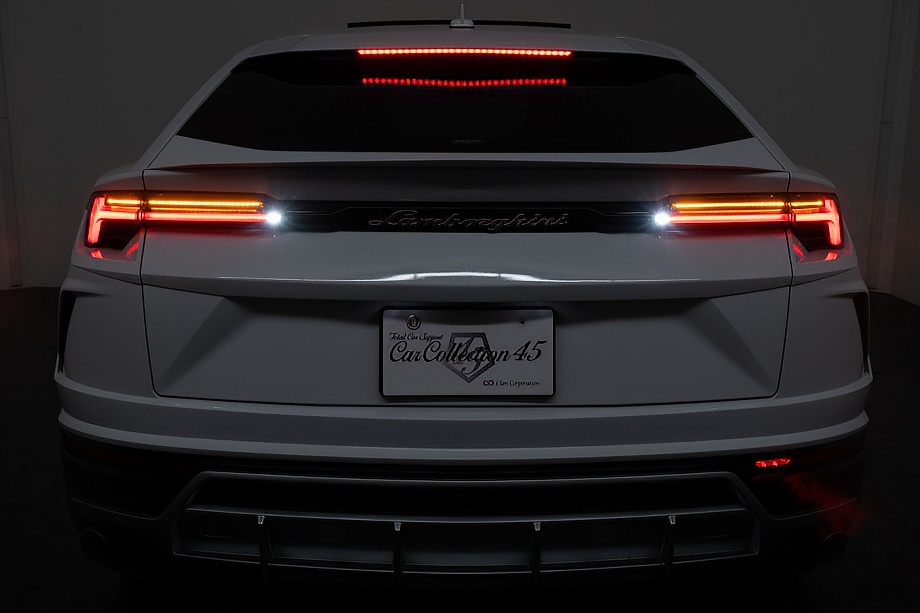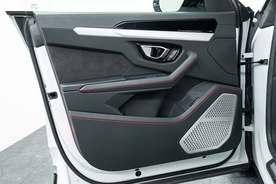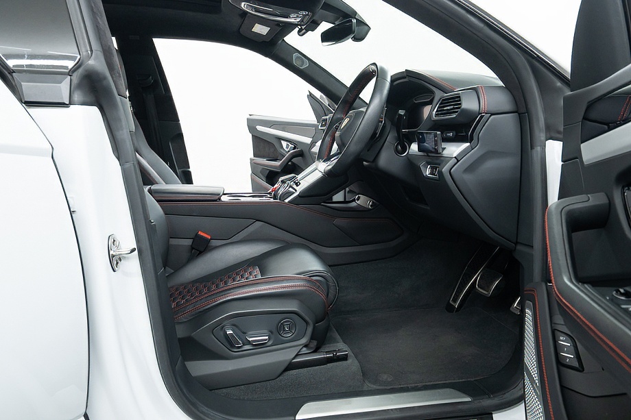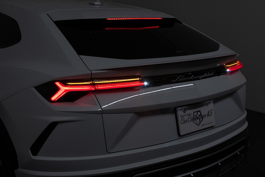 本車両は、存在感あふれるビアンコイカロスのボディカラーに、23インチ「Taigete」ダイヤモンドフィニッシュ鍛造アルミホイールを装着。大径ホイールならではの迫力と、精緻な輝きを放つダイヤモンドカット仕上げが足元を引き締めます。そこに組み合わされるレッドブレーキキャリパーが、さりげなくも力強いアクセントとなり、ランボルギーニらしいスポーティさを際立たせています。さらにブランディングパッケージも備わり、内外装の随所にあしらわれたロゴやディテールが、オーナー様の満足感を一層高めてくれます。
