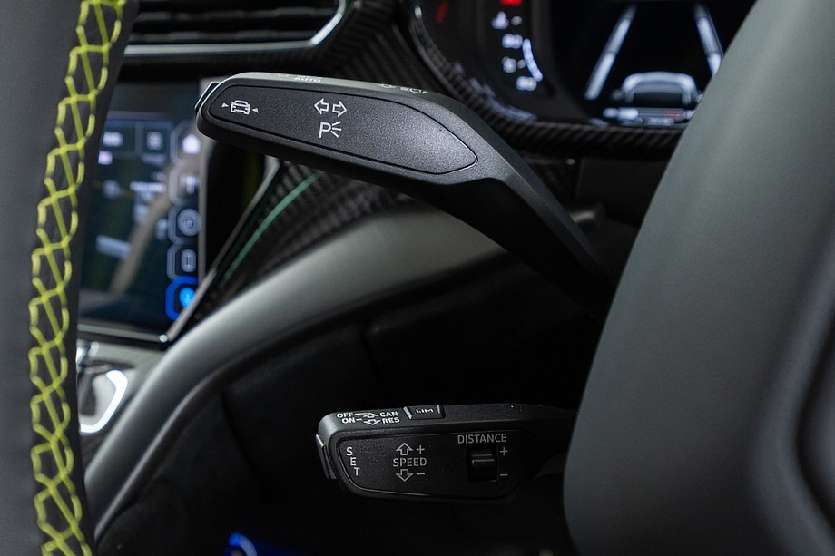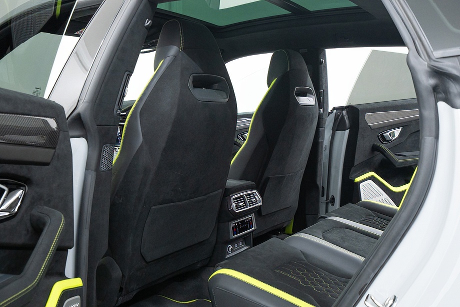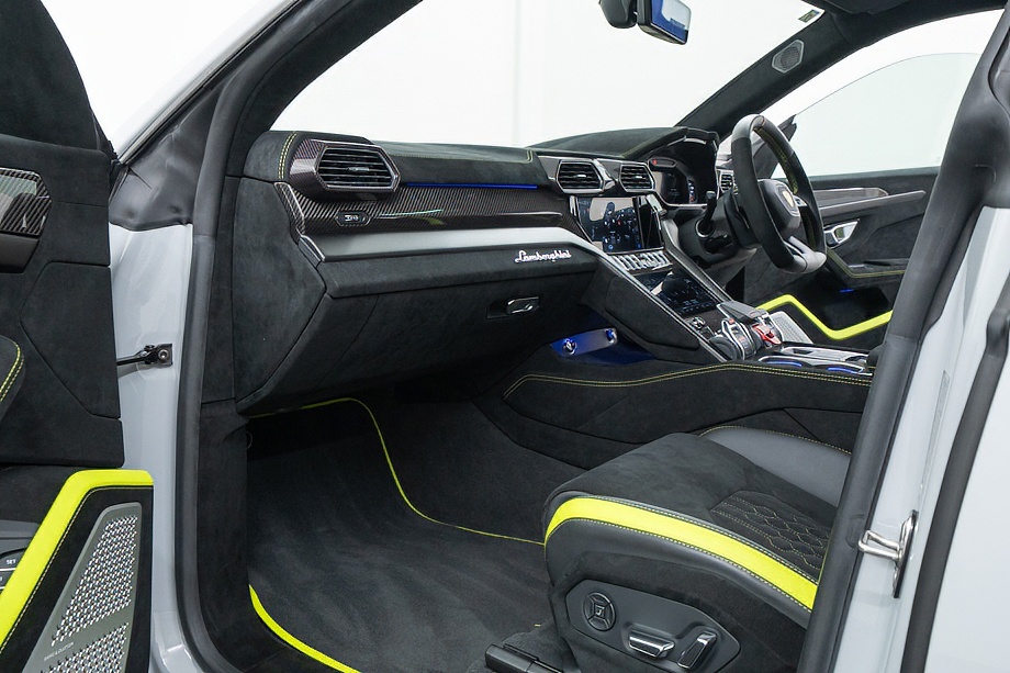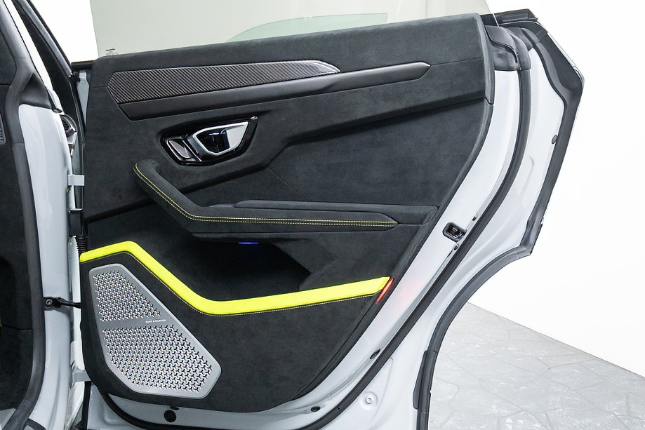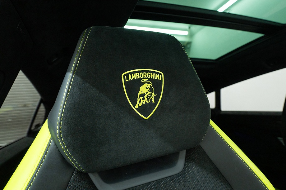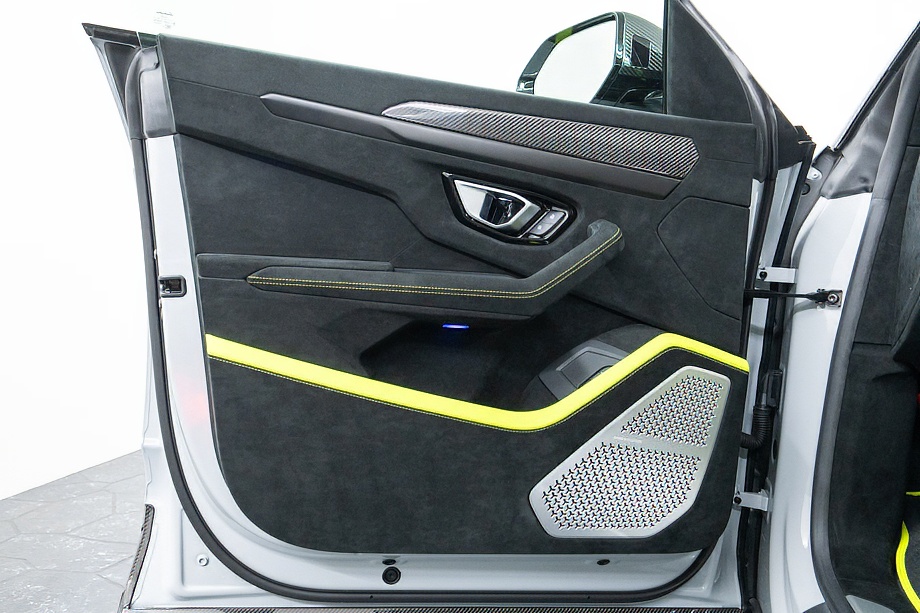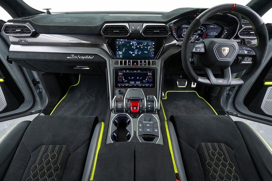 エクステリアはフルエクステリアカーボンパッケージを纏い、機能美と迫力を両立。純正23インチ ダイヤモンドフィニッシュ シャイニーブラックホイールにTitanium Wheel boltを組み合わせ、足元から特別感を演出します。そこに映えるグリーンキャリパーと、強力かつ安定した制動力を誇るカーボンセラミックブレーキ。視覚的な美しさと本質的な性能が、高次元で融合しています。