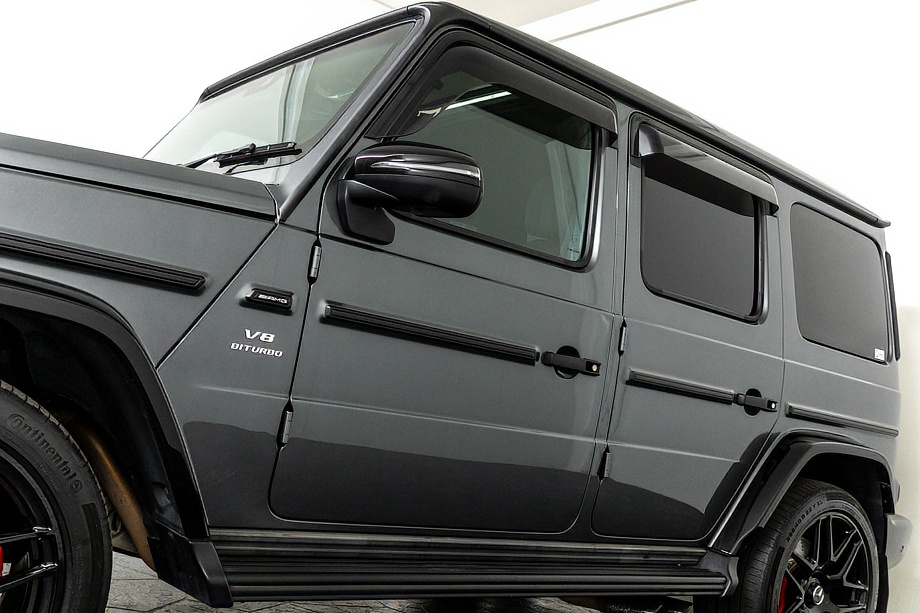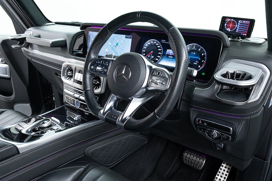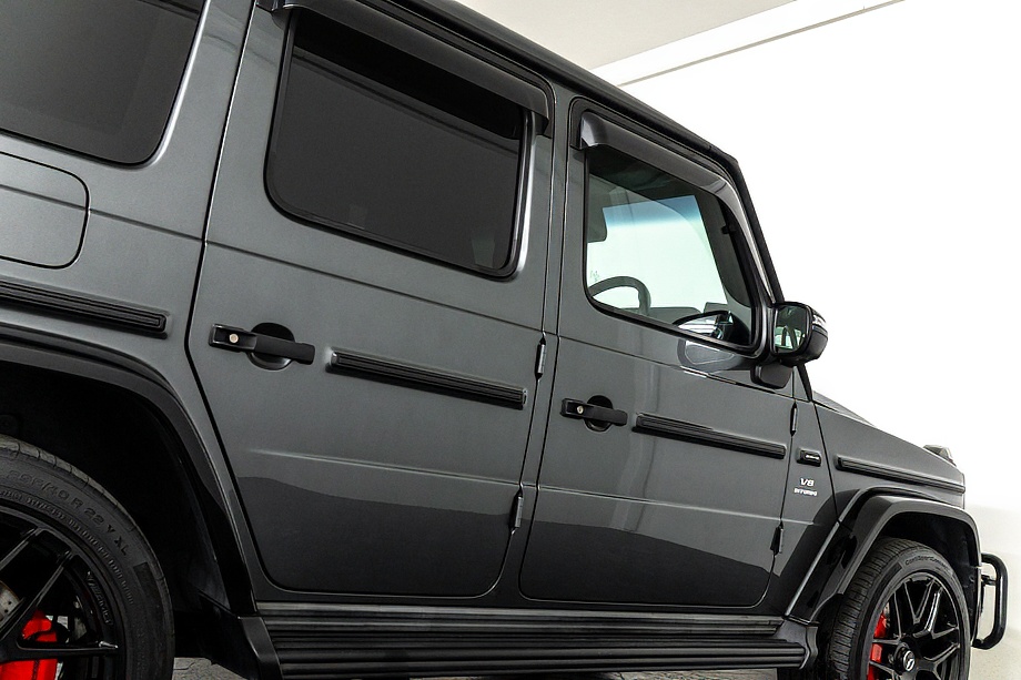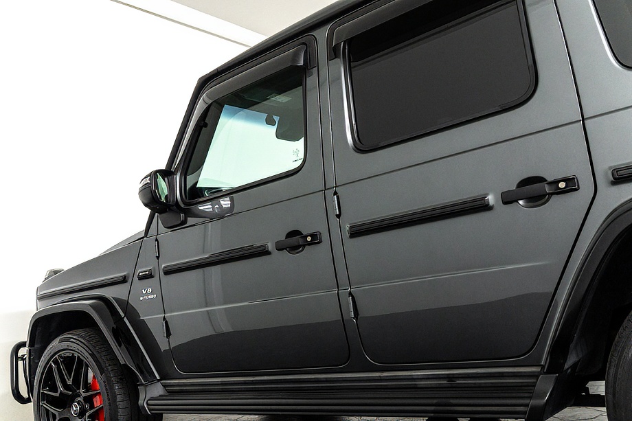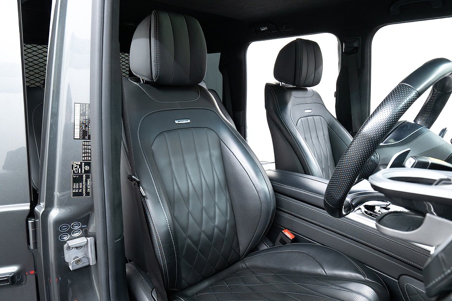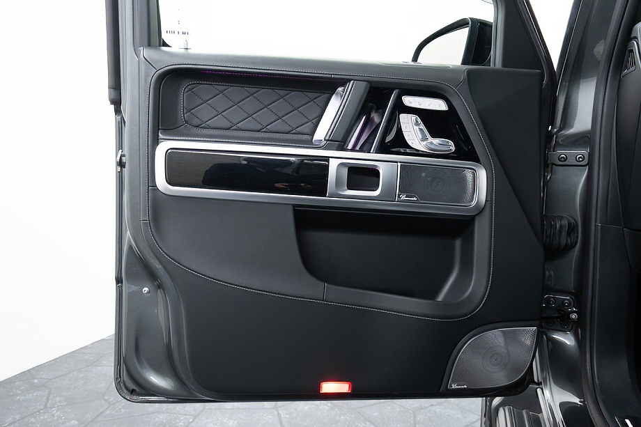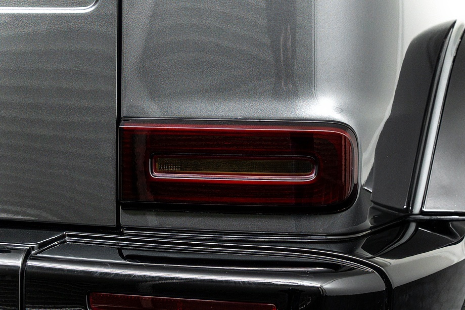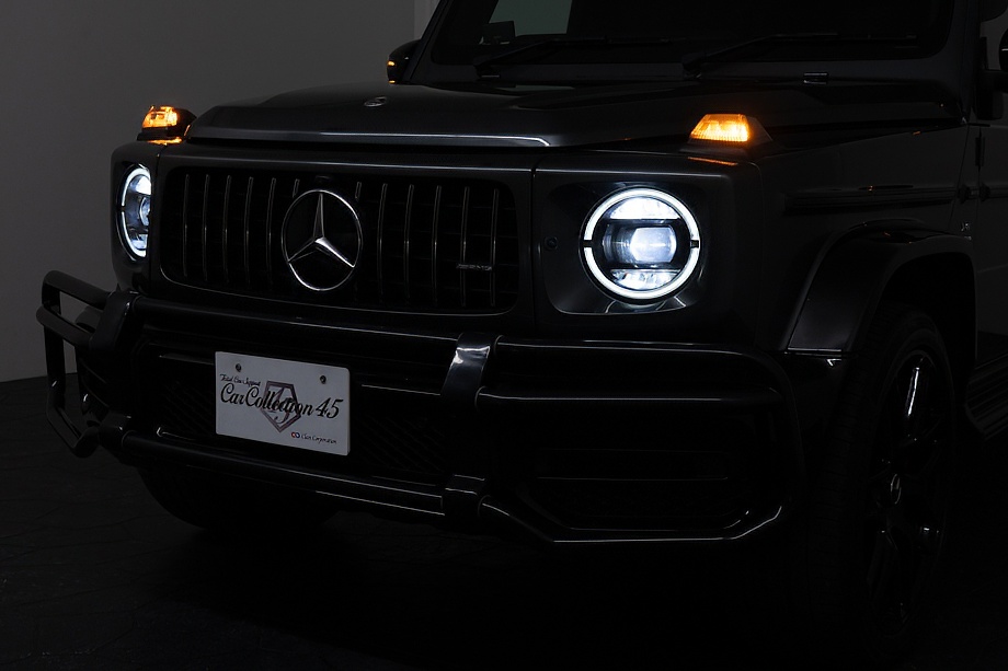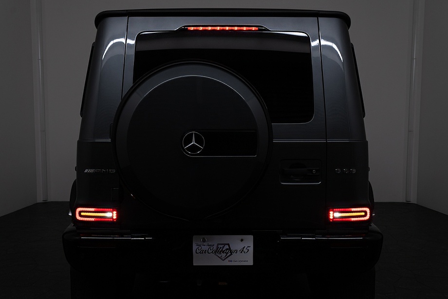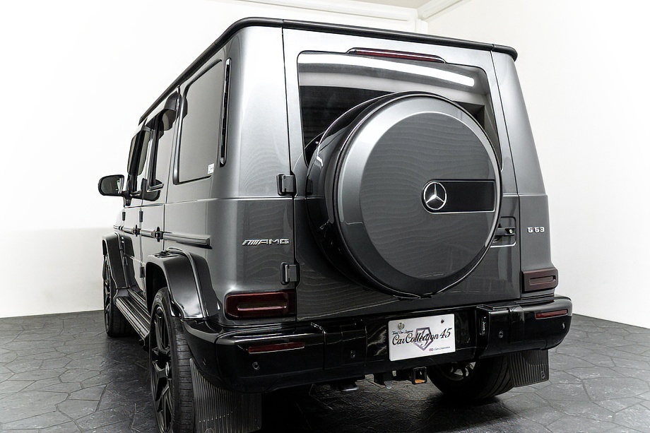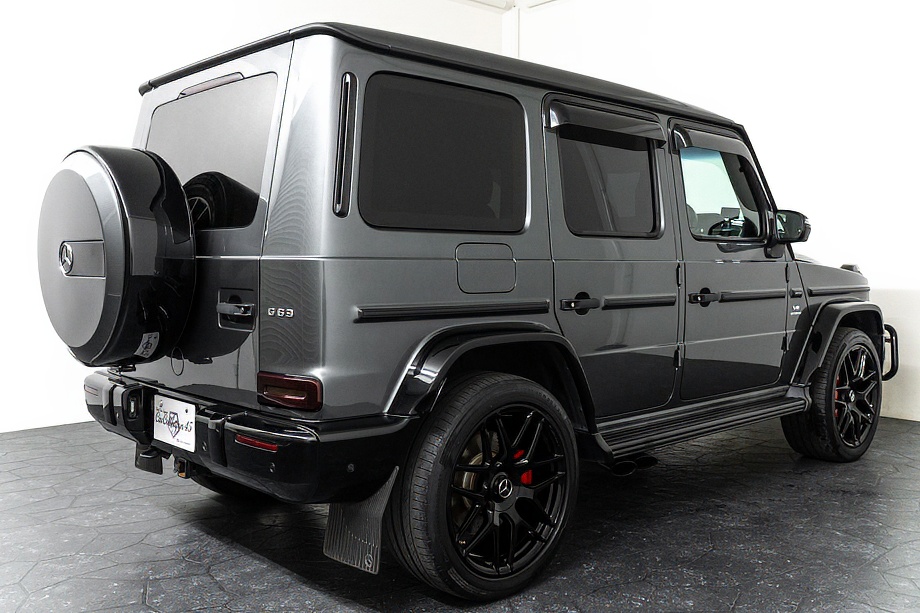 ヘッドライトやテールライト、ボンネットマーカー、スペアタイヤカバーに至るまでナイトパッケージの雰囲気を取り入れ、テールランプやハイマウント、左右リフレクターにはスモーク加工を施しています。加えてフロント・リアバンパーやオーバーフェンダー、サイドステップ、ドアミラーカバー、マフラーエンドまでブラックアウトペイントを採用。G63本来の迫力に、精悍で引き締まった表情が加わっています。