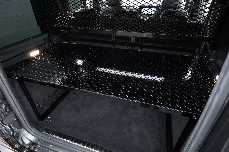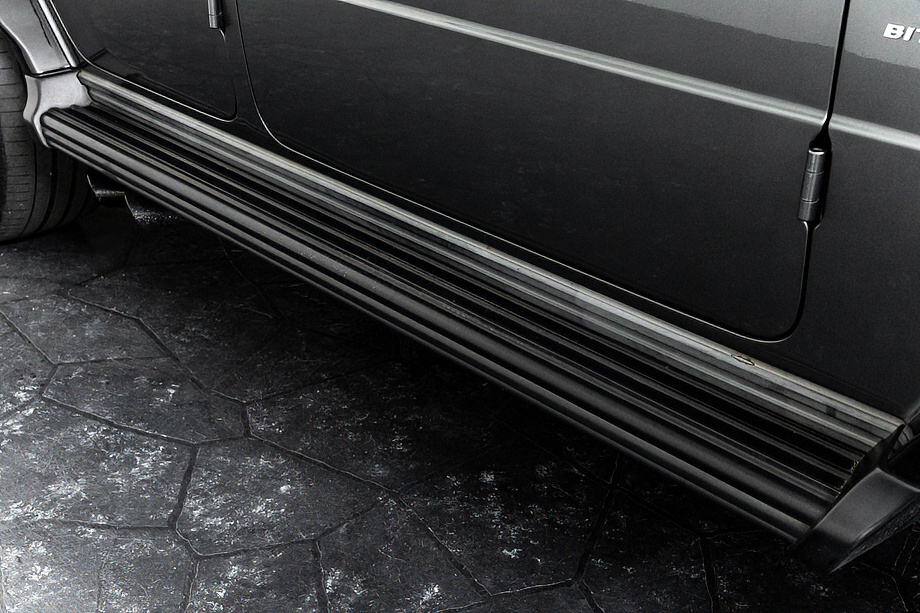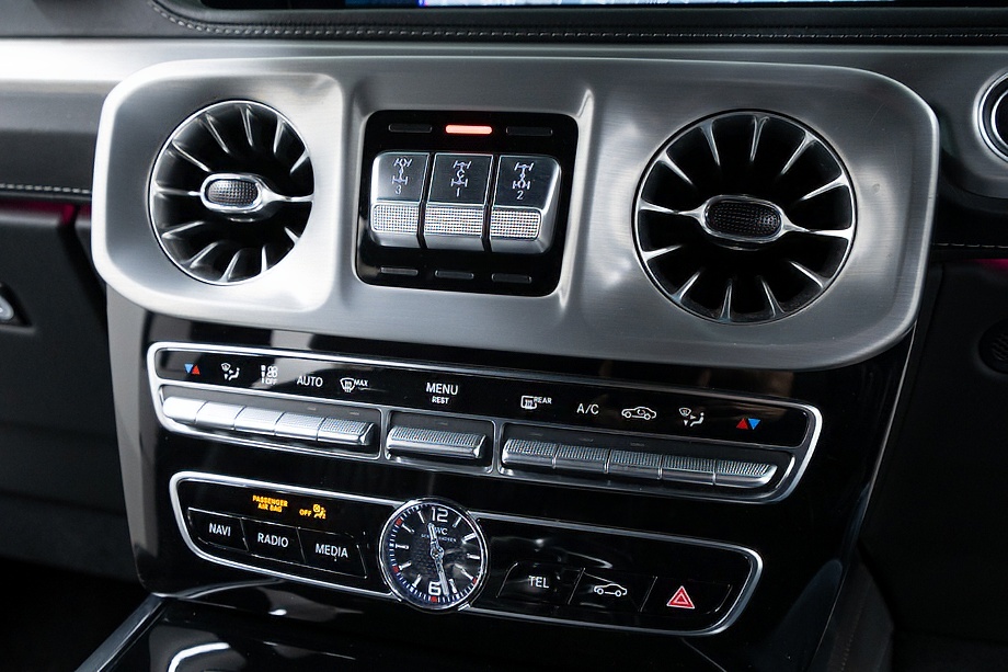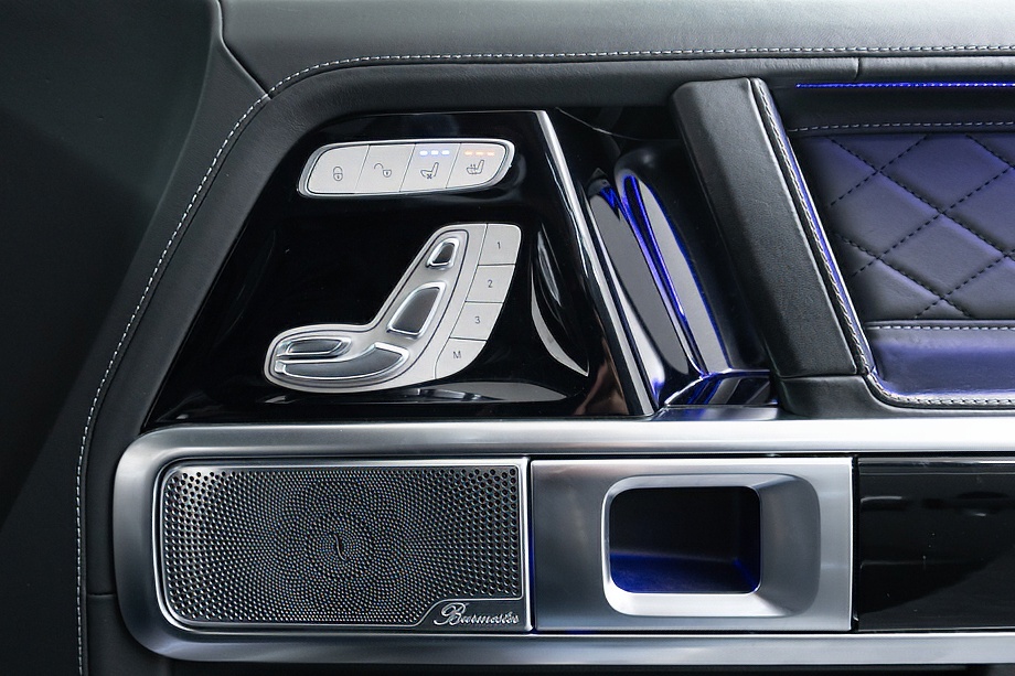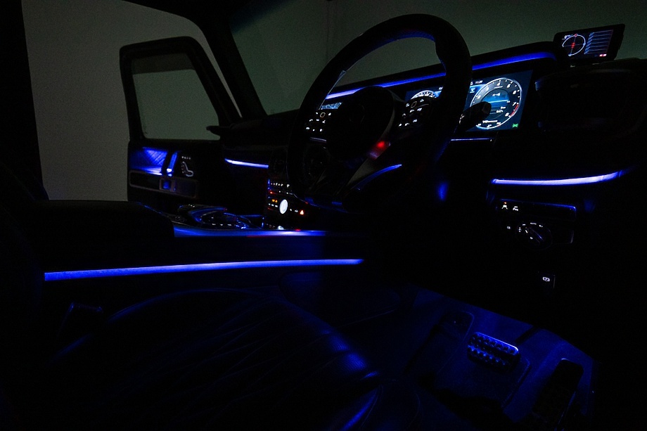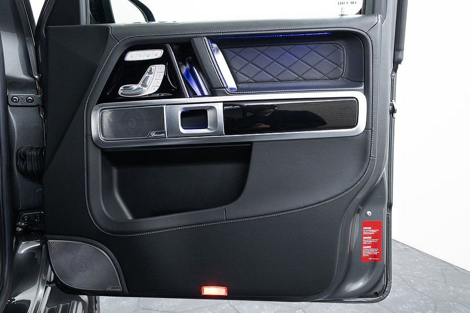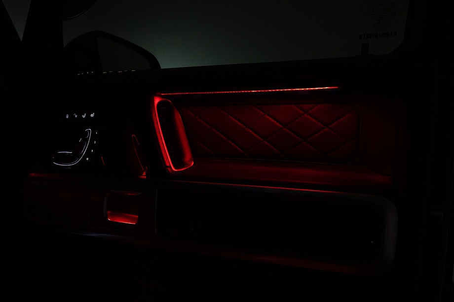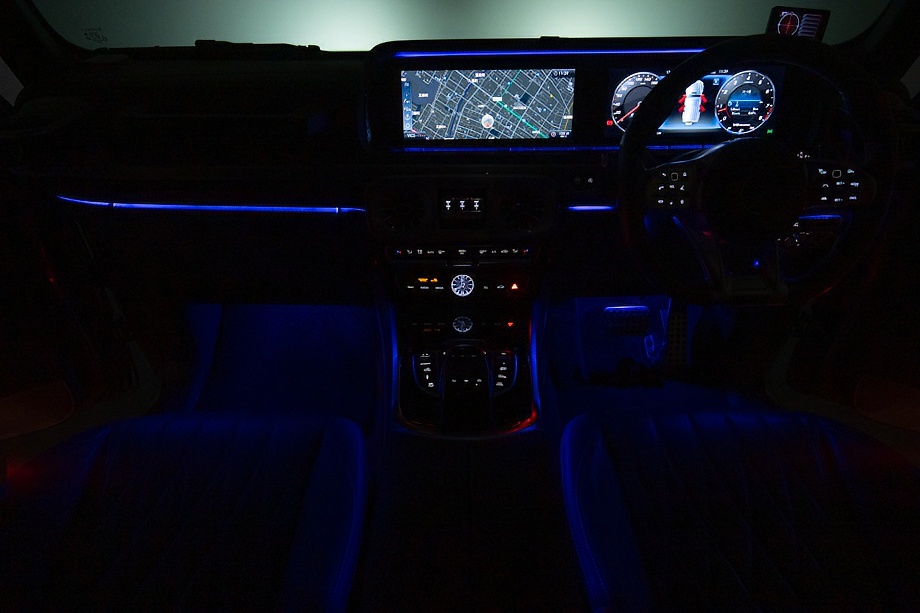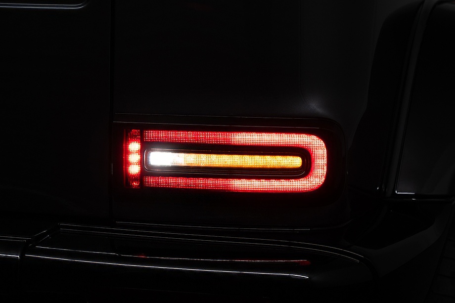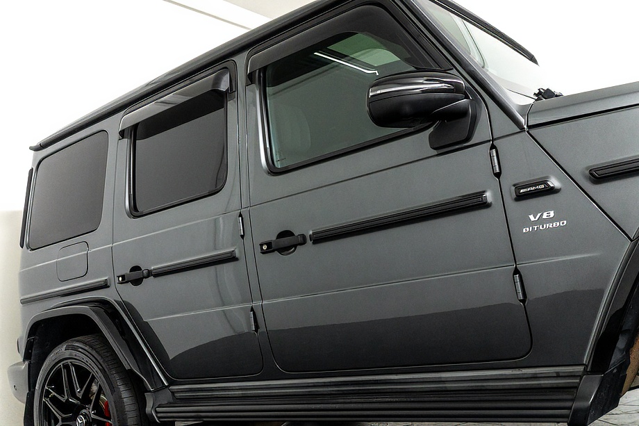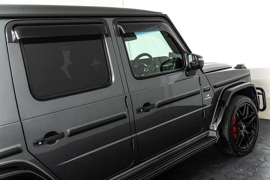 ヘッドライトやテールライト、ボンネットマーカー、スペアタイヤカバーに至るまでナイトパッケージの雰囲気を取り入れ、テールランプやハイマウント、左右リフレクターにはスモーク加工を施しています。加えてフロント・リアバンパーやオーバーフェンダー、サイドステップ、ドアミラーカバー、マフラーエンドまでブラックアウトペイントを採用。G63本来の迫力に、精悍で引き締まった表情が加わっています。