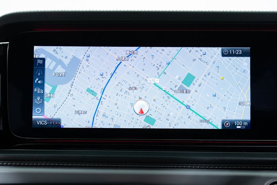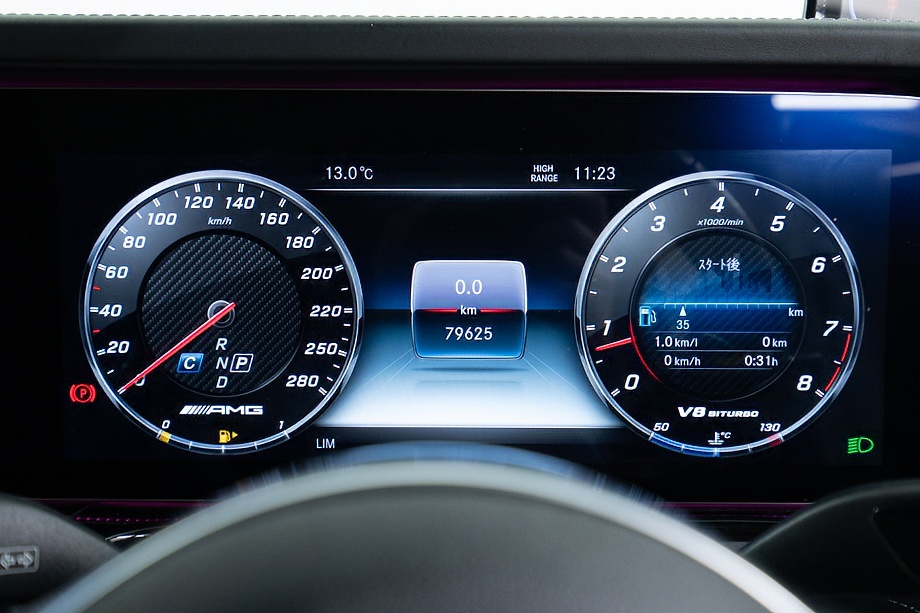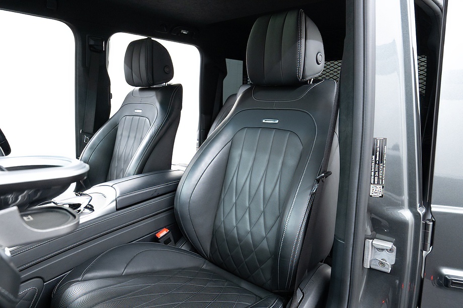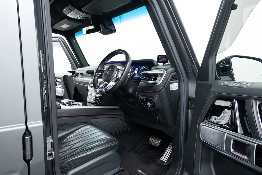 ボディカラーには、深みのある上質な輝きを放つデジーノグラファイトメタリックを纏い、Gクラス特有の力強いフォルムをより洗練された印象へと引き上げています。重厚でありながら、どこかエレガント。その絶妙なバランスが、街中でもひときわ目を引きます。