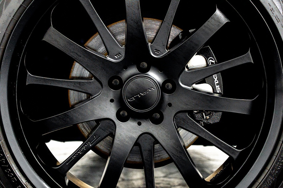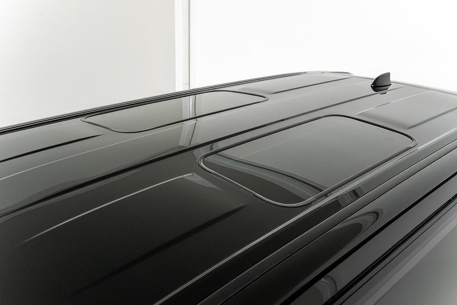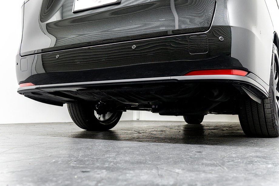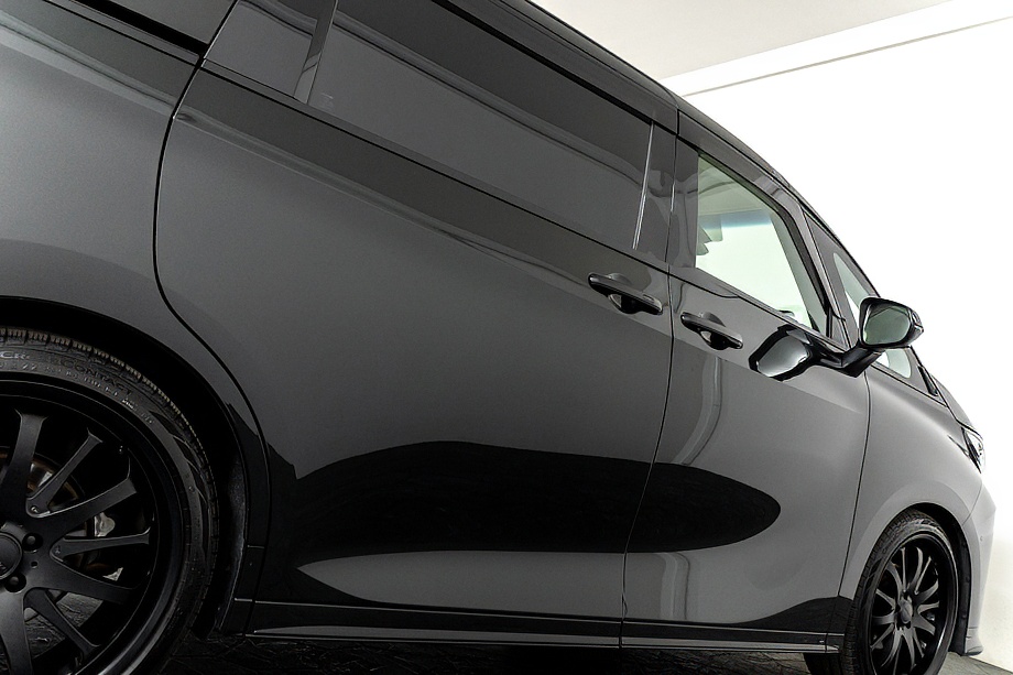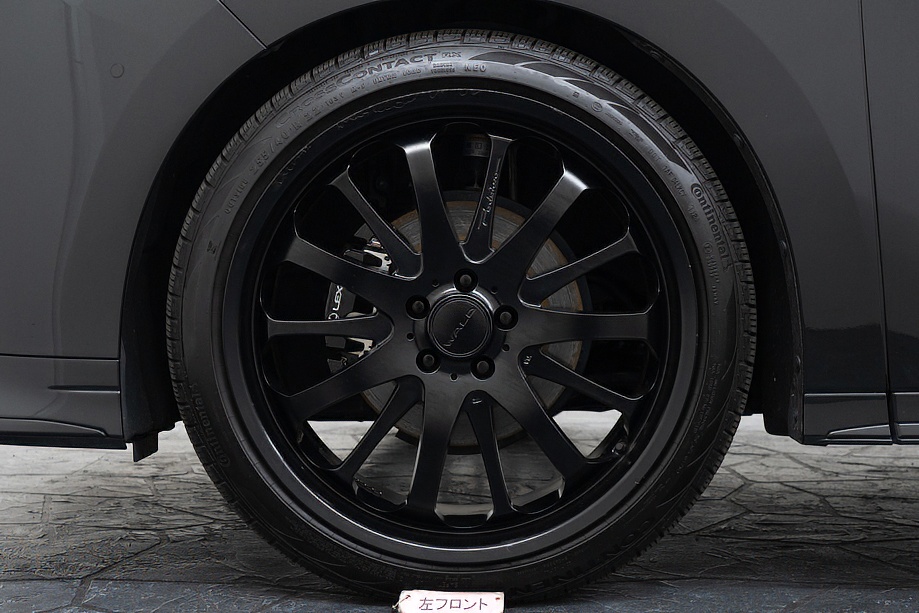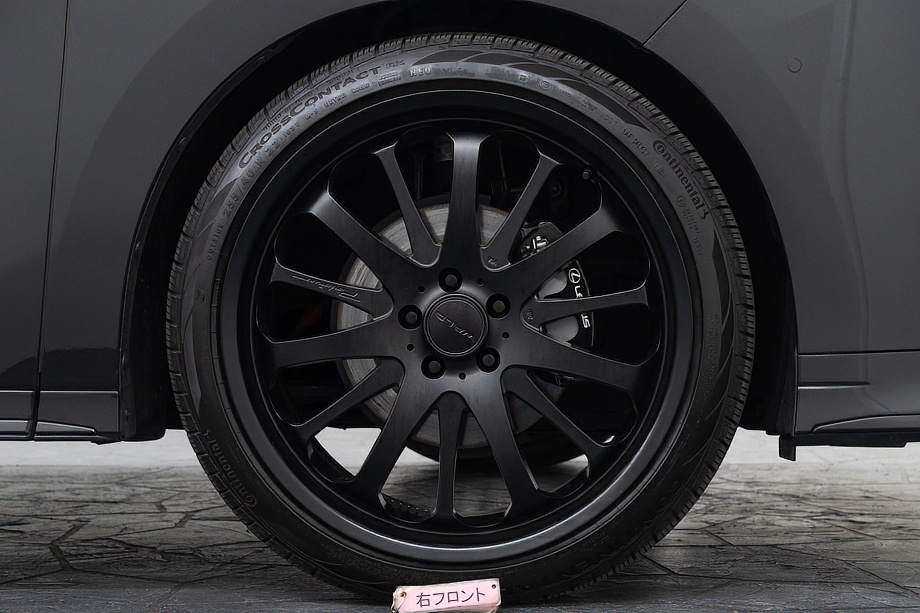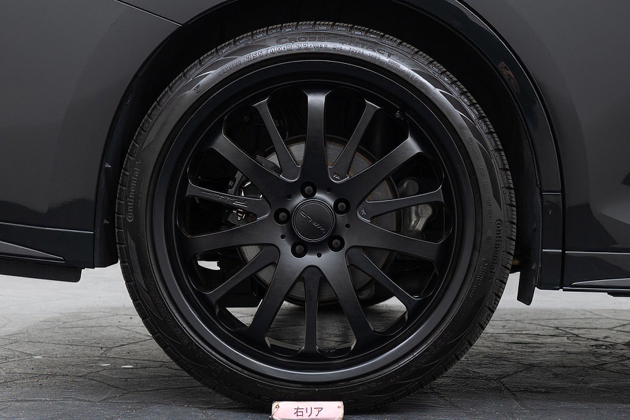 外装は、深い艶と上質な存在感を纏う「グラファイトブラックガラスフレーク」。光の当たり方によって微妙に表情を変え、昼と夜でまったく異なる魅力を見せてくれます。そこに各所ブラックアウトを施し、足元には力強く洗練されたデザインのWALD製22インチホイールを装着。
